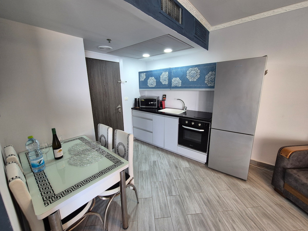 det är lyxiga lägenheter med havsutsikt och en panoramautsikt över balkongen 5 minuter från havet. Lägenheterna på 27 våningen i fyra och har 4 rum : 3 sovrum + stor salong, 2 badrum, 2 toaletter, utrustat kök (diskmaskin, ugn, gasspis, kylskåp, mikrovågsugn.Different rätter, glas) 1 parkeringsplats wi -fi, kabel-TV. I varje sovrum finns en dubbelsäng med ortopedisk madrass, stora skåp, det finns möjlighet till extrasäng för en person (lägenheter rymmer upp till 7 personer)+spjälsäng
