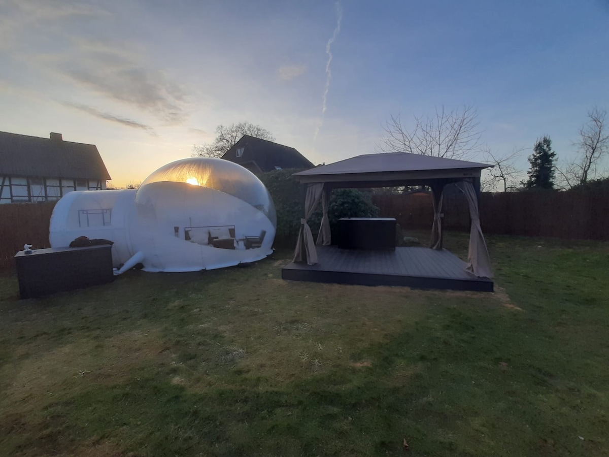 Beim Bubble Tent Welver erwartet dich ein privater Rückzugsort im Grünen – ruhig, leicht und umgeben von Natur. Hier kannst du ankommen, durchatmen und die Welt kurz außen vor lassen. Das Highlight: dein eigener Hot Tub unter freiem Himmel für entspannte Abende. Eine kleine Küche sorgt für gemütliche Frühstücke und unkomplizierte Mahlzeiten. Perfekt für alle, die Privatsphäre, Natur und kleine Auszeiten lieben.