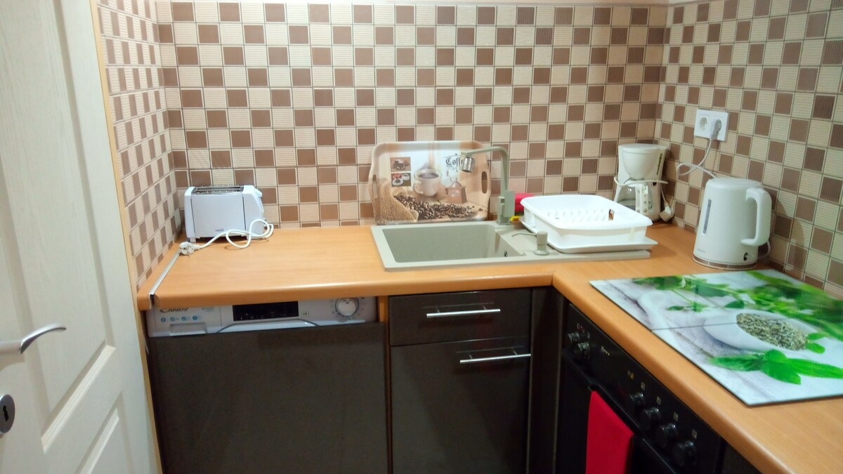 Njut av den eleganta upplevelsen i detta centrala boende. Vänlig lägenhet med utsikt över trädgården och blädderböcker. Välutrustat kök med inbyggd gasspis, el och mikrovågsugn, diskbänk och tvättmaskin. Perfekt layout för par. Sovrum med luftkonditionering. Stadsstrand och Huvudtorget 500 m, Festetics slott 1 km. Husdjur och rökning är inte tillåtna.