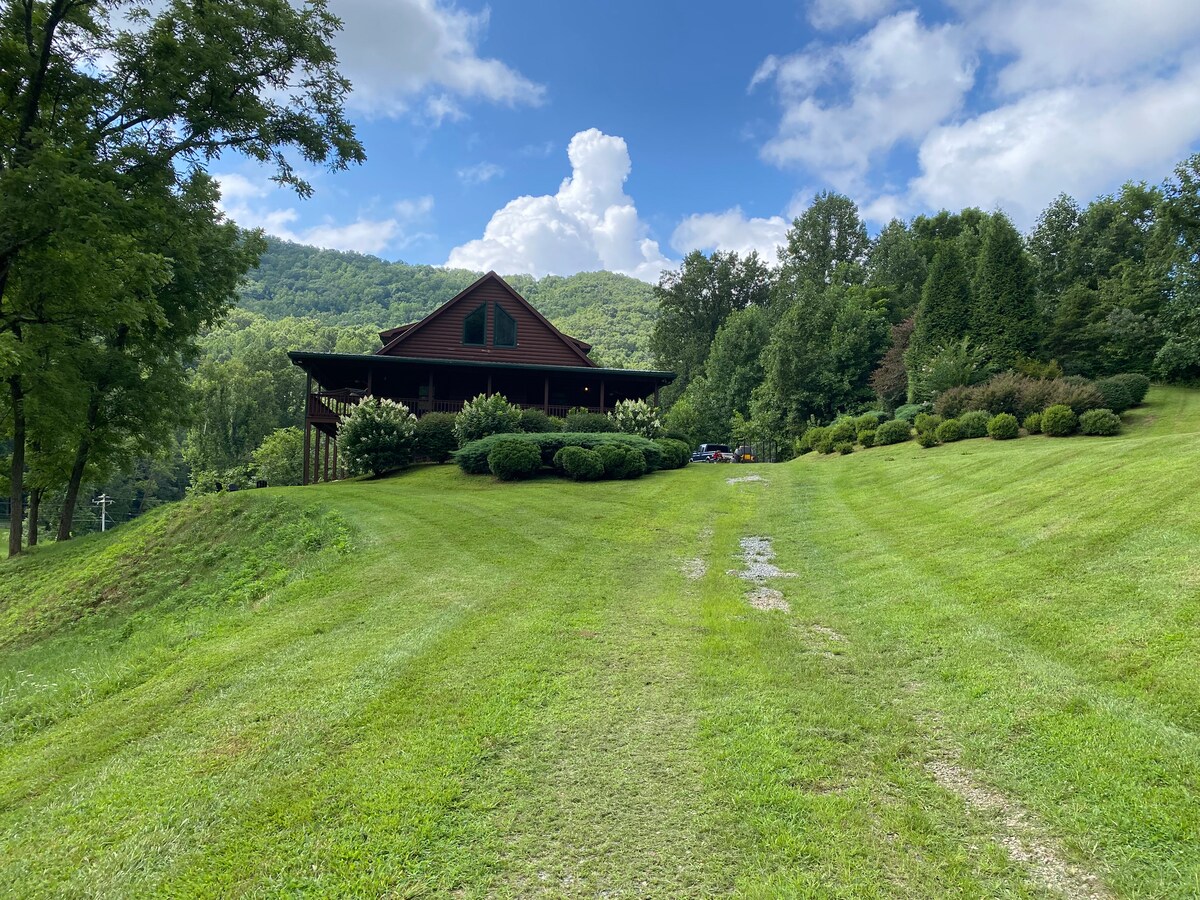 Fly till bergen! Ofläckad och rymlig timmerstuga med privat miljö och långtgående bergsutsikt. Huvudvåningen har katedralstak, öppen spis i sten, öppet kök, sovrum och täckt däck. Nedervåningen har två sovrum, badrum, biljardbord, täckt däck och eldstad. Stanna i en vecka och njut av en ny vänlig stad varje dag. Alla inom 1 timme eller mindre Helen, Blue Ridge, Hiawassee, Blairsville, Murphy, Highlands, Franklin. Glöm inte vingårdarna, kasinon, stigar, tubing etc.