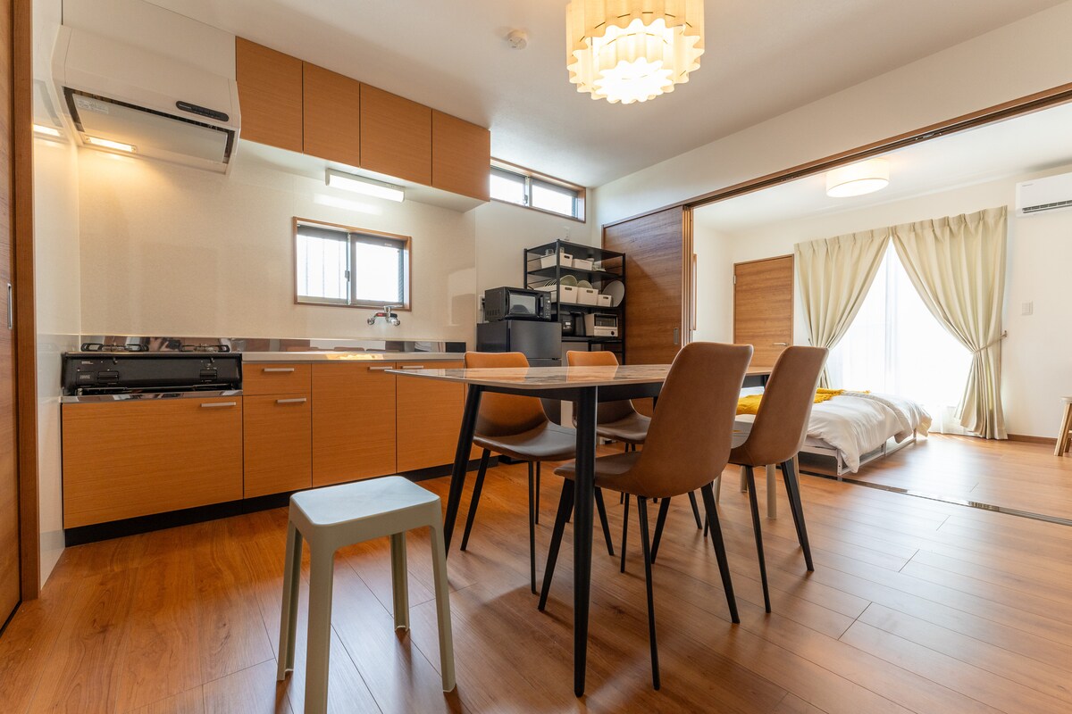 En 2DK-lägenhet byggd 2025. ** Det rymmer upp till 6 personer (bekvämt för 4 personer) ** och är också utrustat med en spjälsäng. En gratis parkeringsplats ingår, vilket gör den idealisk för familjer, grupper och långtidsvistelser. Det finns en stormarknad (2 minuter), närbutik (3 minuter) och 24-timmars apotek (3 minuter) inom gångavstånd, så att du kan bo bekvämt som om du bodde där.6 minuter till fots till Kumamoto Electric Railway "Kenchomae", 5 minuter med bil till Kumamoto City Botanical Garden (One Piece Chopper Statue).Det är också 20 minuter med bil till Aso Kumamoto flygplats och Kumamoto station, så tillgången är utmärkt. Ett nybyggt, bekvämt utrymme Ren och lugn inredning.Rekommenderas för familjer, långsiktiga affärsresor och arbete.