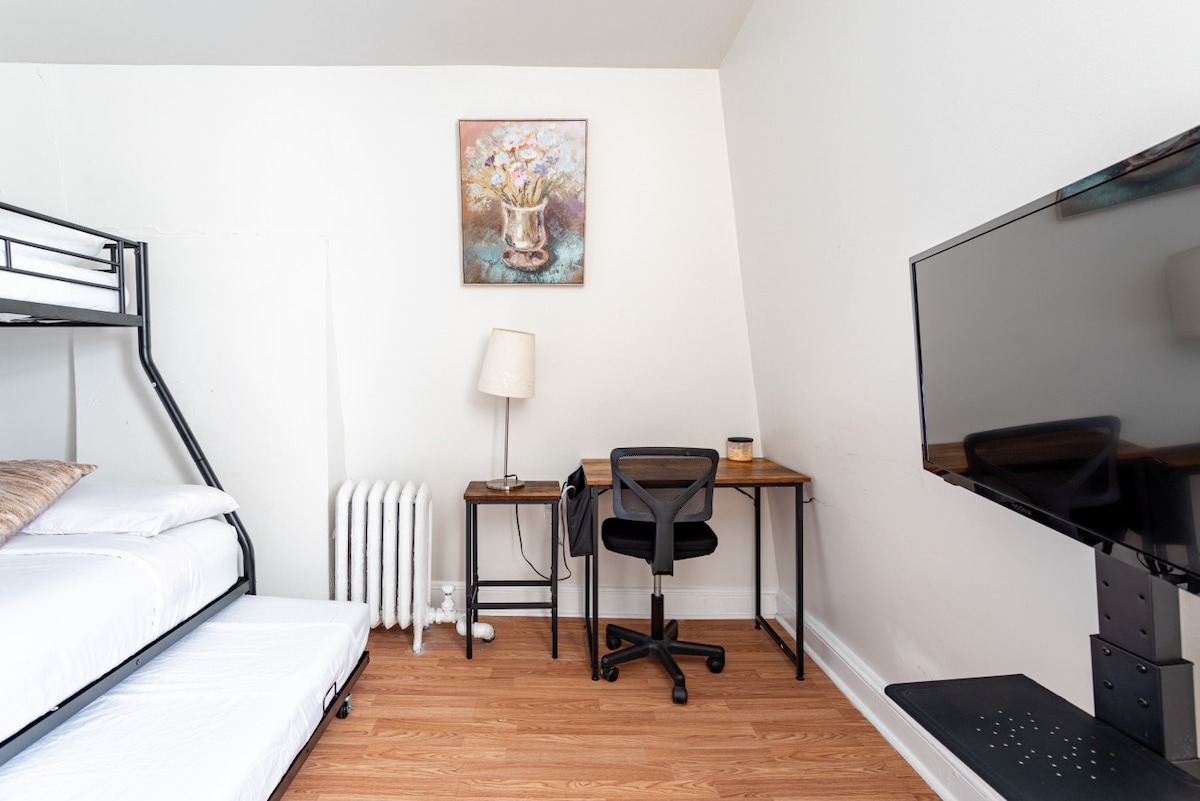 Kom och upplev vårt nyligen renoverade hem, med helt ny installerad luftkonditionering, steg från vår charmiga centrum och direkt tåg till NYC. Avsiktlig maximalistisk inredning med massor av konst runt huset. Mörkläggningsgardiner i varje rum och TempurPedic madrass i minnesskum. 🌿Grönskan här på varje hörn känns som en frisk fläkt. Boendet är genomtänkt inrett och blandar vintagecharme med moderna designdetaljer, vilket skapar det perfekta utrymmet för både avkoppling och inspiration.