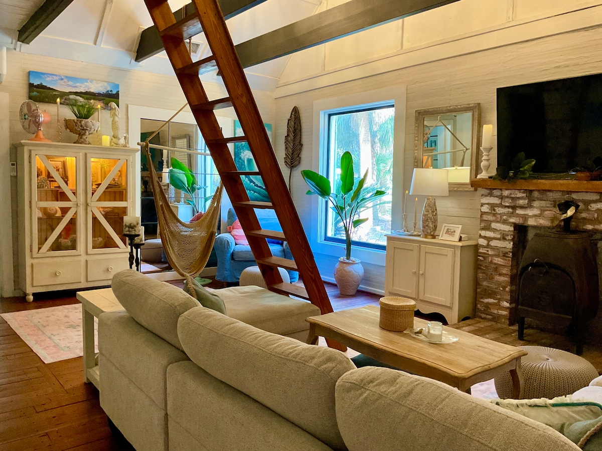 Denna charmiga stuga ligger i hjärtat av allt. Nära till familjevänliga aktiviteter och nattliv, beläget på huvudgatan i Bluffton SC. Parkera och gå till restauranger, butiker, barer och gallerier. Mitt i hjärtat av Bluffton, 2 kvarter till stadens brygga och den berömda Church of the Cross. Du kommer att älska mitt ställe på grund av ljuset, de bekväma sängarna och mysen. Vi är djurvänliga, rymmer alla typer av gäster och städas alltid professionellt. Telsa laddningsstation tillgänglig