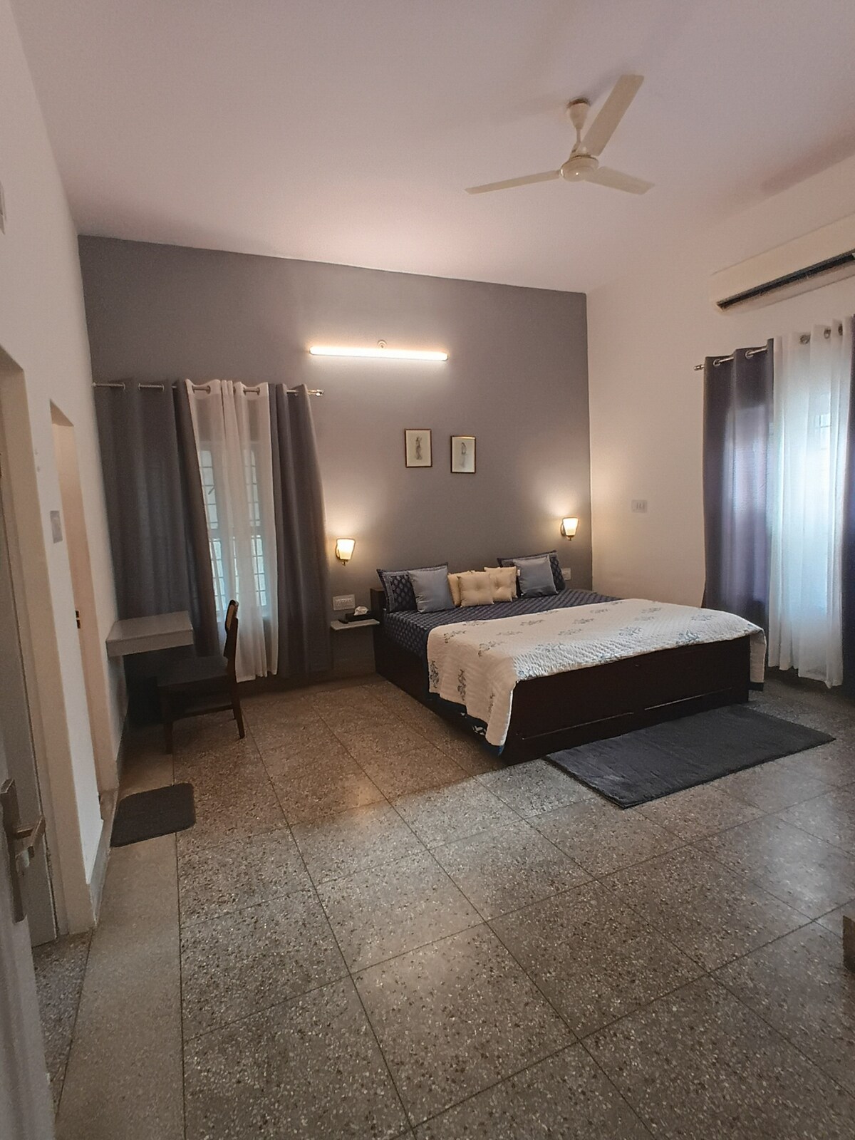 Detta rymliga 3BHK Airbnb erbjuder en perfekt blandning av modern komfort och stil. Den expansiva vardagsrummet är idealisk för avkoppling medan den eleganta matplatsen garanterar njutbara måltider. Köket gör det enkelt att laga mat. Den mysiga trädgården erbjuder en fridfull tillflyktsort utomhus. Koppla av på verandan eller njut av Netflix på 65-tums LED-TV. Med gott om utrymme och genomtänkta bekvämligheter är detta moderna boende perfekt för familjer eller grupper som söker en elegant, bekväm vistelse med en touch av lyx och komfort.