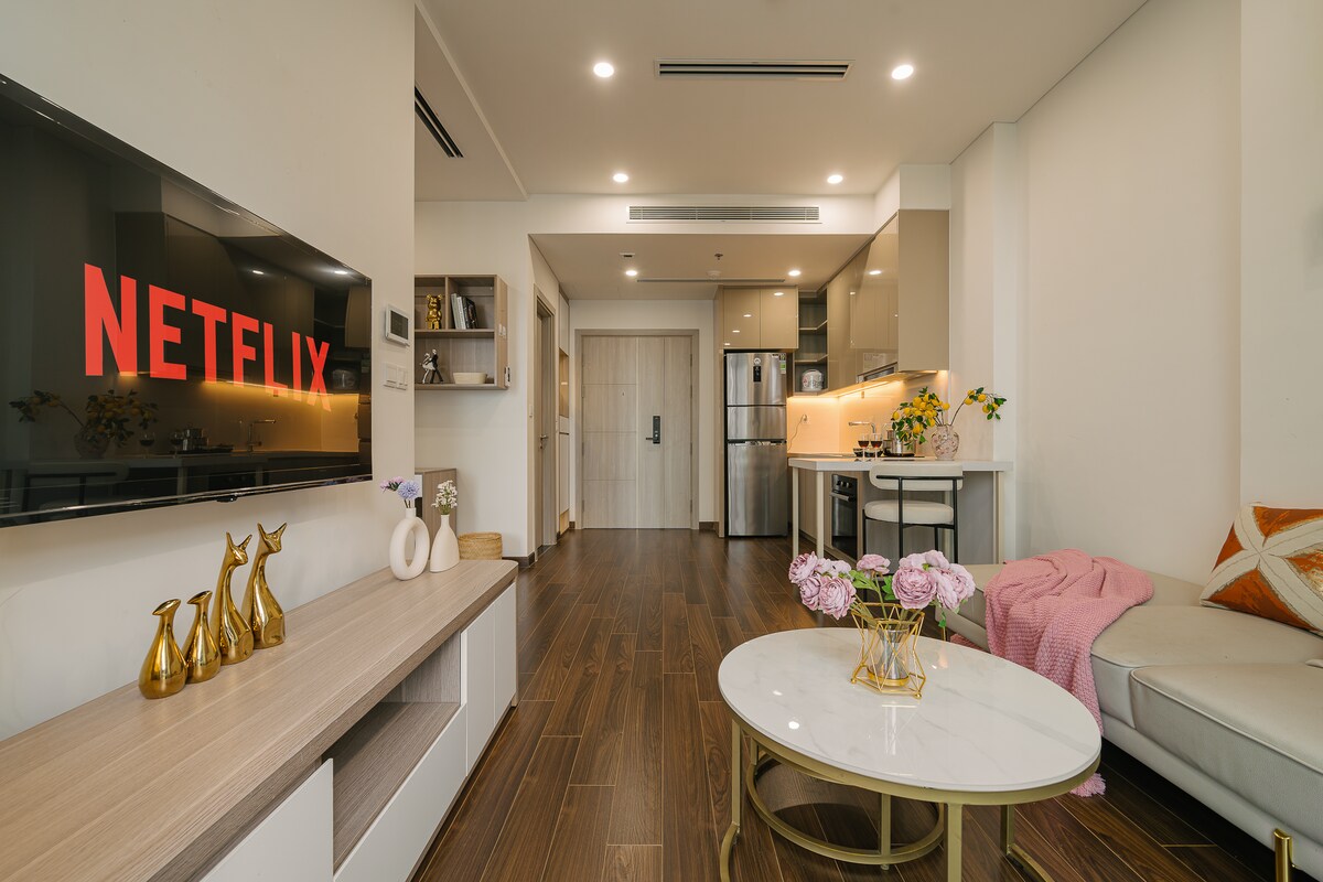 Nằm trong khu căn hộ cao cấp bậc nhất, căn studio được thiết kế tối ưu ánh sáng, không gian mở thoáng đãng với cửa sổ lớn nhìn ra thành phố. Nội thất sang trọng nhưng gần gũi: giường nệm cao cấp, sofa thư giãn, bếp nhỏ gọn đủ đồ, bàn làm việc tiện nghi, Wi-Fi tốc độ cao và TV thông minh. Khách được sử dụng hồ bơi, phòng gym, khu BBQ và vườn trên cao. An ninh 24/7, thang máy thẻ từ đảm bảo sự riêng tư và an toàn tuyệt đối.