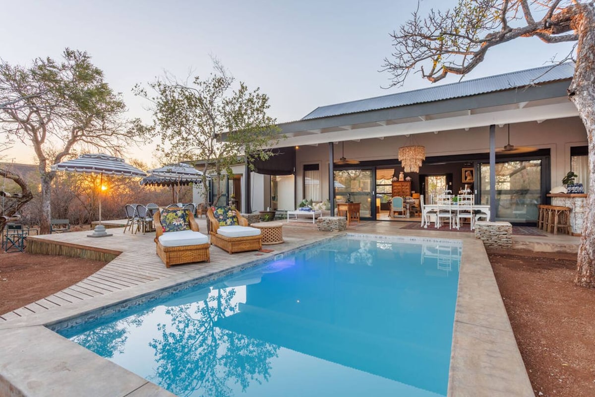 Bushveld Villa med pool, eldstad och utomhusboende