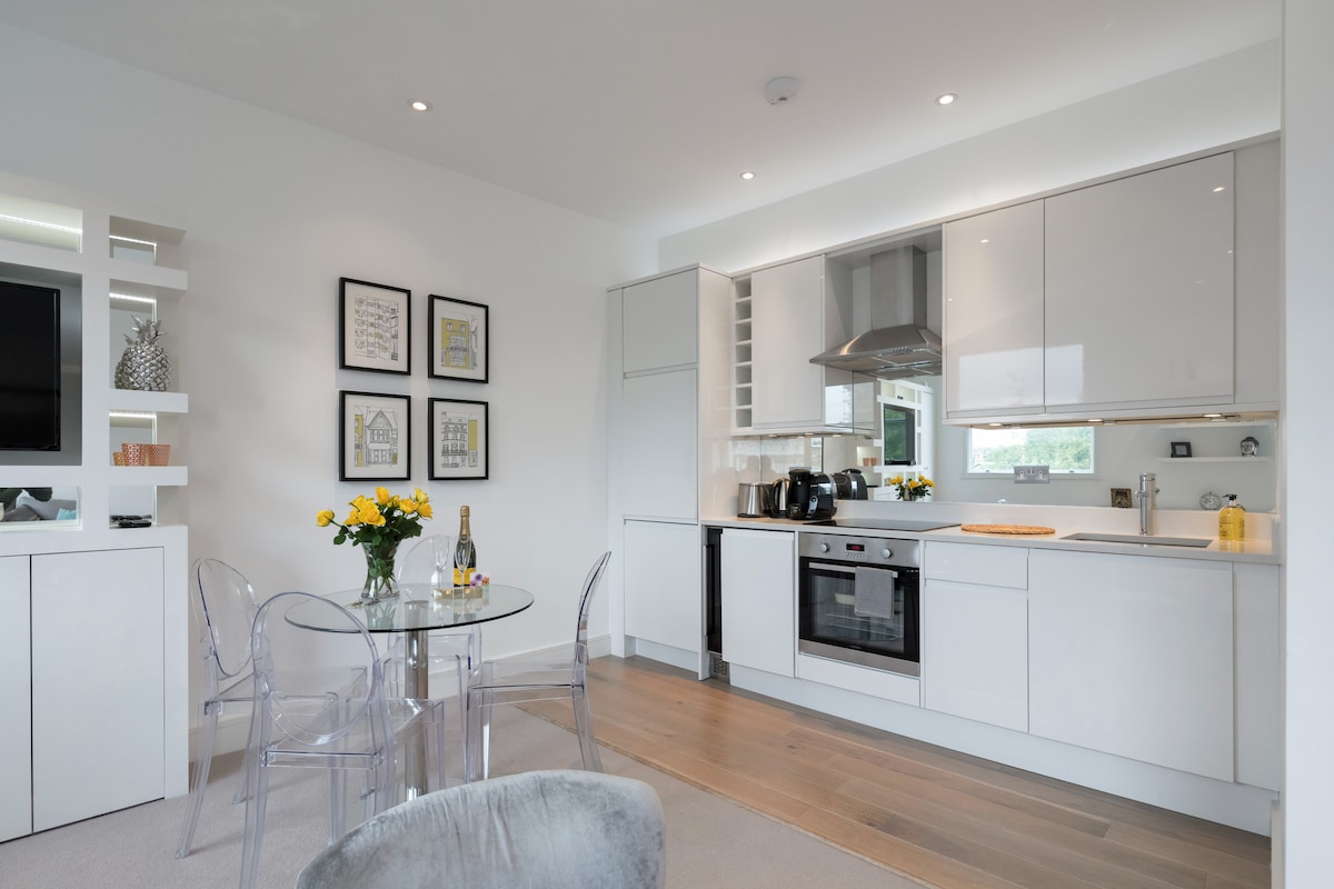 Detta lyxiga boende på översta våningen har utsikt över fälten och inbjuder dig att koppla av. Ultrarent, fridfullt och vackert utformat. Utrustad med allt du behöver och mer. Brygg färskt bön-till-kopp-kaffe med Ninja Luxe Coffee Machine. Streama dina favoritprogram på Smart TV, spela brädspel som grupp eller arbeta där utsikten inspirerar dig. Oavsett syftet med din vistelse, arbete eller avkoppling - detta är rätt ställe! London ligger i närheten, men känns som en värld bortom. Alltid en plats att parkera också!
