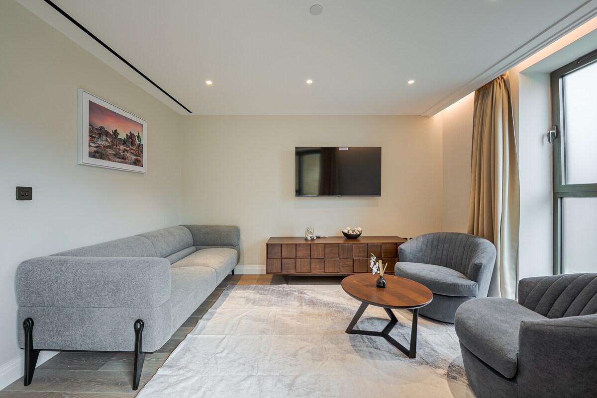Mitt emot Buckingham Palace mitt i centrala London. En lyxig lägenhet med ett sovrum, i ett historiskt 1800-talets Grade II Listed townhouse. Ultra-prime St. James's Park läge, 10 minuters promenad från sevärdheter, t.ex. Parlamentet, Big Ben, Westminster Abbey, Belgravia & Mayfair. En lugn tillflykt. Noggrant inrett, fullt utrustat kök, lyxig inredning och concierge dygnet runt. Perfekt för barn, 1 sovrum med dubbelsäng och 1 bäddsoffa (i vardagsrummet eller sovrummet, ditt val).