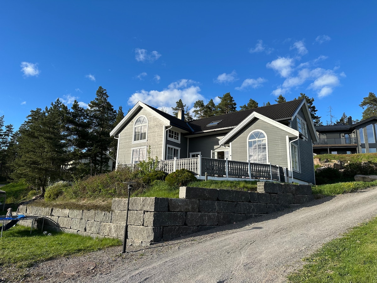 Bara 50 minuter från Oslo, är detta rymliga hus beläget i ett underbart, lugnt, soligt läge vid havet. De flesta rum erbjuder panoramautsikt över fjorden. Huset har en modern mörk interiör, ett fullt utrustat öppet kök och ett rymligt vardagsrum som ansluter med skjutbara glasdörrar till en stor veranda, västerut och med utsikt över havet. Parkering på gården. Laddare för elbil är tillgänglig mot avgift.