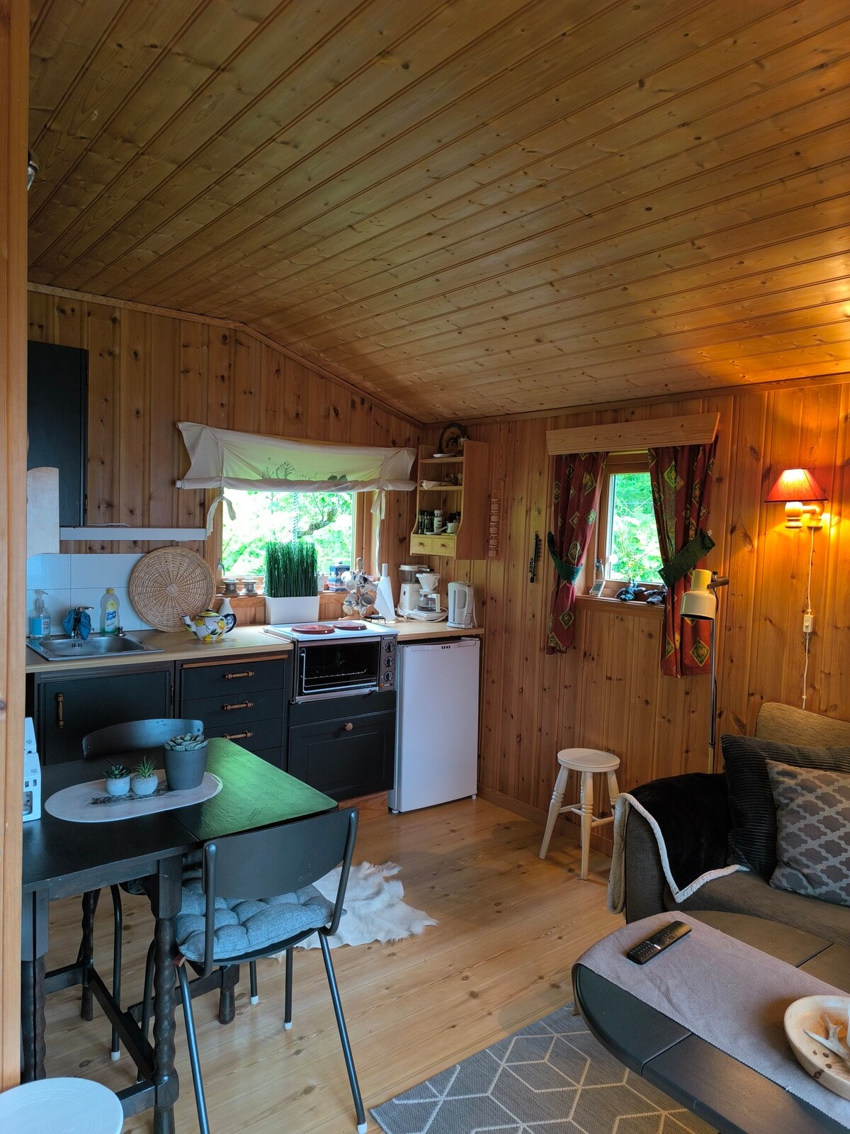Trevlig timmerstuga med enkel standard. Beläget ensam i bergig tallskog, en trevlig utgångspunkt för bergsturer på sommaren och vintern. Inget vatten eller elektricitet. Solcellssystem för ljus, propan för kokning och kylskåp. Brand för uppvärmning. Fristående uteplats ca 15 m från stugan. Parkering 30 meter under stugan. Sänglinne och handdukar kan hyras för 100 kr, - per uppsättning. På grund av COVID-19-situationen uppmanas gäster att ta med egna sängkläder. Slutstädning är därför också obligatorisk