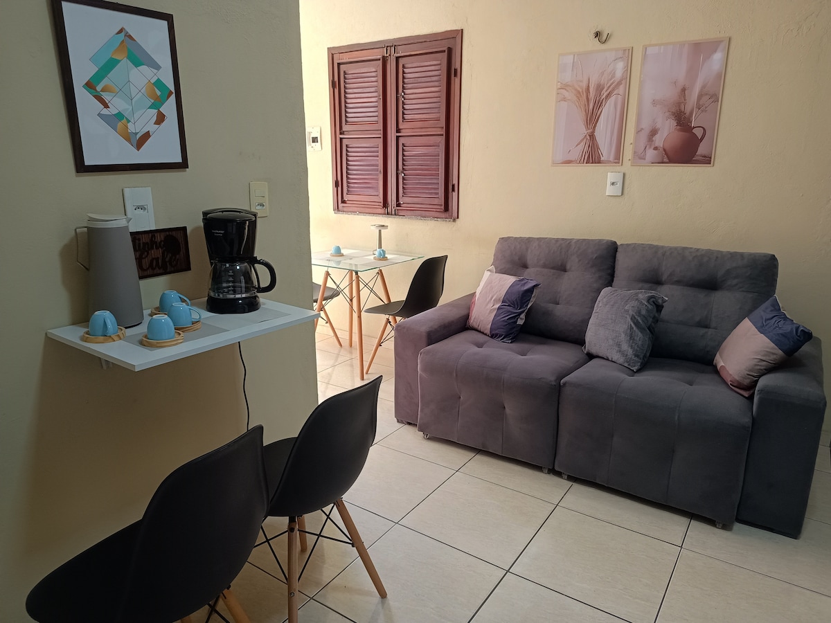Elegant hus, med konstverk, i en lugn och säker villa 15 minuter från Iracema Beach. Det är ett område med 130 m², med 2 badrum, 2 sovrum (1 stort mezzanin med dubbelsäng, badrum och garderob; och 1 sovrum), vardagsrum, utrustat kök och terrass - för upp till 4 personer. Vila Nanan ligger på en återvändsgränd, med en grind, kamera och övervakning. (Det finns rabatter för längre vistelser). Helt privat boende. Fester och evenemang är inte tillåtna.