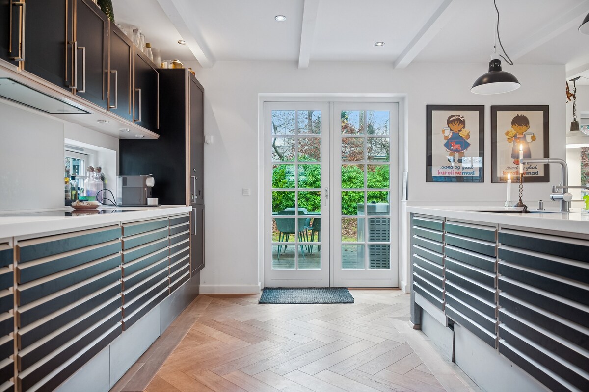 Charmig 270 kvm villa 300 m promenad från de fantastiska stränderna i den fashionabla Hornbæk i Nordsjälland med massor av små caféer, restauranger, butiker och mysigt strandliv. Ankomst via den vackra uppfarten, mycket grönområde och trädgård. Rymmer 12 personer; tre sovrum och två badrum. Gigabit internetuppkoppling och fotbollsbord och ett överflöd av utrymme inklusive en mycket stor terrass med matbord och vardagsrum. Perfekt för familjeresor liksom för affärssessioner.