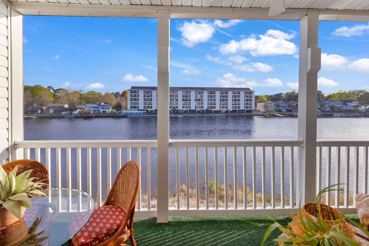 Detta är en vacker tvårumslägenhet med två badrum. Den ligger på bottenvåningen och har fantastisk utsikt över Intracoastal Waterway. Gå ut genom bakdörren på den skärmade verandan och ta några steg till den upplysta gångvägen, observationspiren och båt/fiskebryggan. Det ligger i ett säkerhetsgrindat område med säkerhet dygnet runt. Denna lägenhet ligger några minuter från Broadway at the Beach, flygplatsen, Highway 31 med snabb tillgång till norra och södra stränder, livsmedel och stränderna.