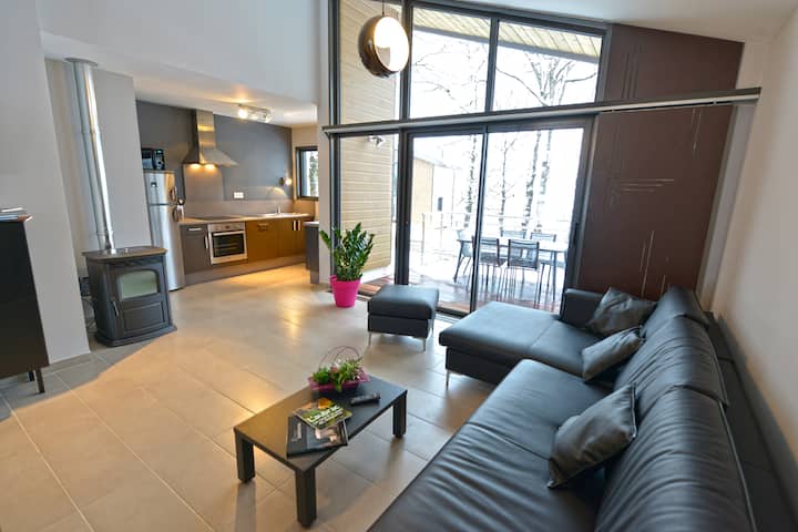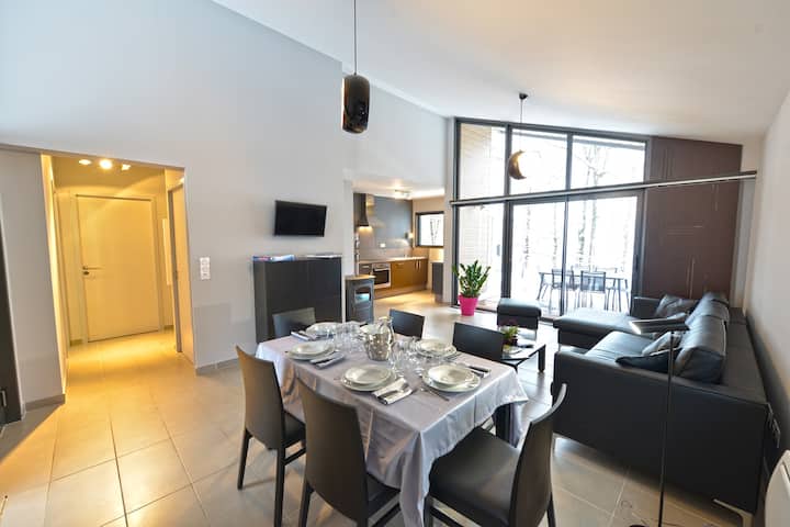 Denna lägenhet med service har kombinerad modernism och komfort i en naturlig miljö.