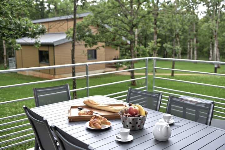 Det är mitt i en liten ek på 4 hektar, en oas av lön och lugn, att våra 15 alpstugor på 70 m² och receptionen är inbäddade.