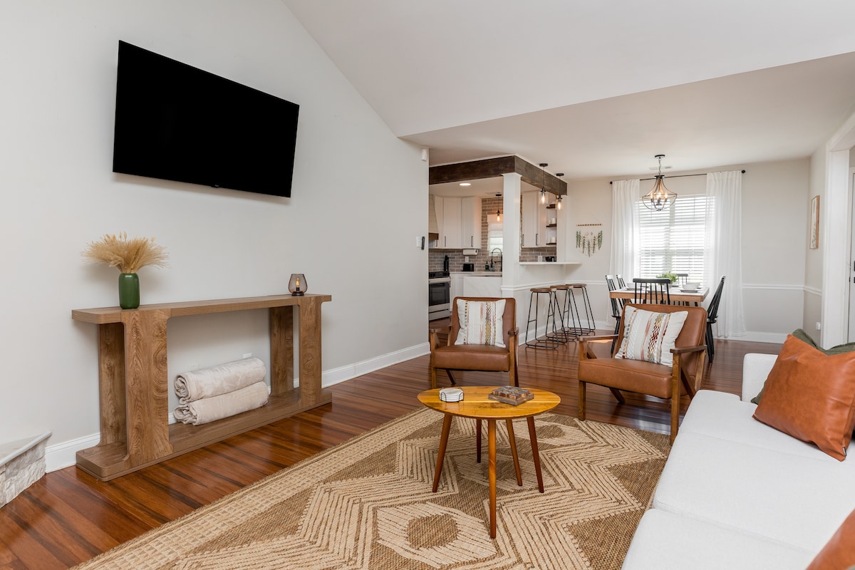 This curated collection of modern meets farmhouse is your essential Middle Georgia stay. High cathedral ceilings, hardwood floors, and all new furniture make Green Meadow a stylish getaway. Minutes to Rigby's Water Park, Robins AFB, Historic Downtown Macon, and the Georgia National Fairgrounds! The 2 queen beds and 2 full bathrooms plus a laundry room make for an easy family stay. The 12x26 foot inground pool (open May through October 1st)