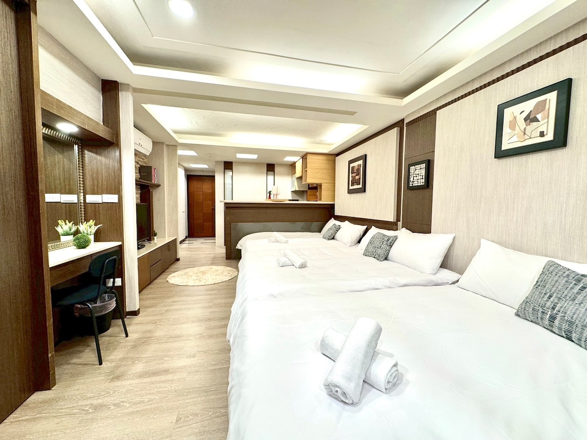 Huset ligger i centrum av Banqiao, New Taipei City, nära Banqiao City, Expressway, bussterminal, busstation, järnvägsstation och MRT Pananan Line (Xinpu), 2 minuter till fots, det finns en offentlig betald inomhusparkering och parkering på sidan av vägen, 200 meter och 4 minuter till fots, det är en busshållplats och MRT Xinpu Station Exit 2, Yatanqiao, Longshan Temple, Ximen, Taipei Station, Taipei101, transport är bekvämt att besöka olika attraktioner. Huset ligger på 2: a våningen i en lägenhet i ett gammalt samhälle, det finns ingen hiss, behöver gå totalt 16 steg, samhället är säkert och tyst och enkelt, fastigheten är utrustad med lufttäta ljudisolerade fönster, oroa dig inte för lugnet när du sover, det finns ett café, superhandlare, skönhetsbutik, shopping för bekväm levande maskin. Inomhusutrymmet är 3 sovrum (A.4 personrum 2 dubbelsängar, rum B.2 personrum 1 dubbelsäng, C.Tema barnrum 1 standard enkelsäng), 1 vardagsrum, 1 matsal, 1 kök, 1 vått/torrt badrum, 1 fungerande balkong (rökutrymme) med gratis tvättmaskin och torktumlare, rymligt utrymme ca 100m ². Huset är utrustat med en nivå av energisparande och kylning och uppvärmning luftkonditionering (2025/3/17), en 43-tums smart internet-TV, gratis Wifi och kabelprogram, och schampo, kroppstvål, balsam och handtvål, och 1 badhandduk per person.(På grund av miljöhälsobestämmelser behöver tandborste, tandkräm, rakhyvel, kam ta med din egen) En rymlig och bekväm boendemiljö som fortfarande kommer att få dig att känna dig som hemma under din resa.