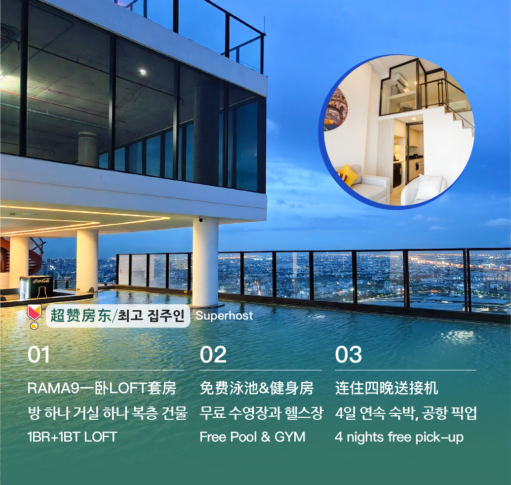 Välkommen att välja och bo i min lägenhet och jag hoppas att du får en bra resa till Thailand. Huset ligger i RAMA9, LOFTLÄGENHET levereras 2024.Rummet är ca. 40 kvm, inklusive ett sovrum, ett vardagsrum och matsal, ett kök och ett badrum, som enkelt rymmer 3 vuxna. (‼️ tips: När antalet personer i bokningen är 1-2, finns det som standard bara en säng i sovrummet, om du behöver lägga till en bäddsoffa, fyll i antalet personer som 3 vid bokningstillfället, och kontakta oss efter bokning för att informera oss, vi kommer att ordna personal för att förbereda bäddsoffan före din vistelse‼️) Priset för bokningen inkluderar användning av hela huset, samt fitnesscenter, pool och delat kontorsutrymme.