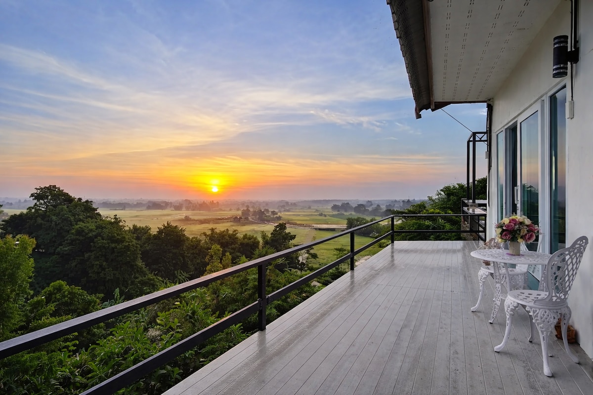 Escape to a peaceful private villa surrounded by nature in Chiang Rai. The highlight of the house is the large 270° terrace, perfect for watching sunrise, sunset and enjoying the mountain views. The villa includes a cozy bedroom, a private kitchen and a spacious outdoor terrace where guests can relax and enjoy the quiet countryside. Highlights: • Private villa • 270° panoramic terrace • Beautiful sunrise view • Quiet countryside atmosphere • Near Chiang Rai Airport