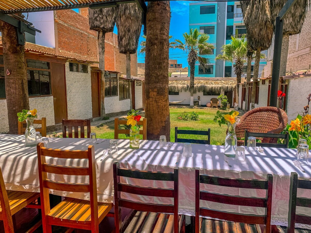Nuestra casa es acogedora,tiene un lindo jardin y palmeras con hamacas en las que puedes descansar una linda tarde.Esta ubicada en un balneario llamado Huanchaco,donde puedes gozar de la tranquilidad de un pueblo pequeño con una hermosa playa en la cual podras practicar Surf y paseos en nuestros tradicionales caballitos de totora. Compartiremos almuerzos juntos y prepararemos una comida de la zona.