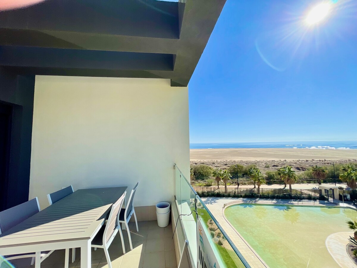 Överlägsen lägenhet ligger precis vid stranden och med havsutsikt och pooler. Den har två sovrum, ett med en dubbelsäng (med eget badrum) och ett andra med två enkelsängar. Andra badrummet, stort vardagsrum-matsal med tillgång till terrassen, perfekt utrustat amerikanskt kök med alla nödvändiga redskap och terrass med magnifik havsutsikt. Punta del Moral bostadsområde vid stranden, med simbassänger, padel och gym