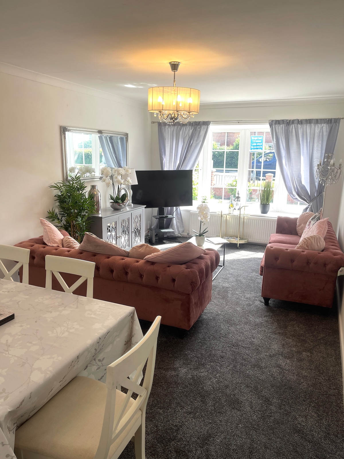 Ta dig tid att koppla av i detta lugna, eleganta, lantliga boende. Njut av att spendera tid i lyxig miljö, omgiven av jordbruksmark och fin utsikt med dina bekvämligheter i hemmet. Njut av utsikten från din super kingsize-säng, stora fristående badkar eller Juliet balkong. Koppla av i det stora vardagsrummet och titta på dina favoritfilmer på 75-tums smart-TV, WIFI och surroundljud. Du har ett kök som är utrustat med elektrisk fläktspis och 2 spishällar för att laga dina måltider och ett matbord att äta dem vid.