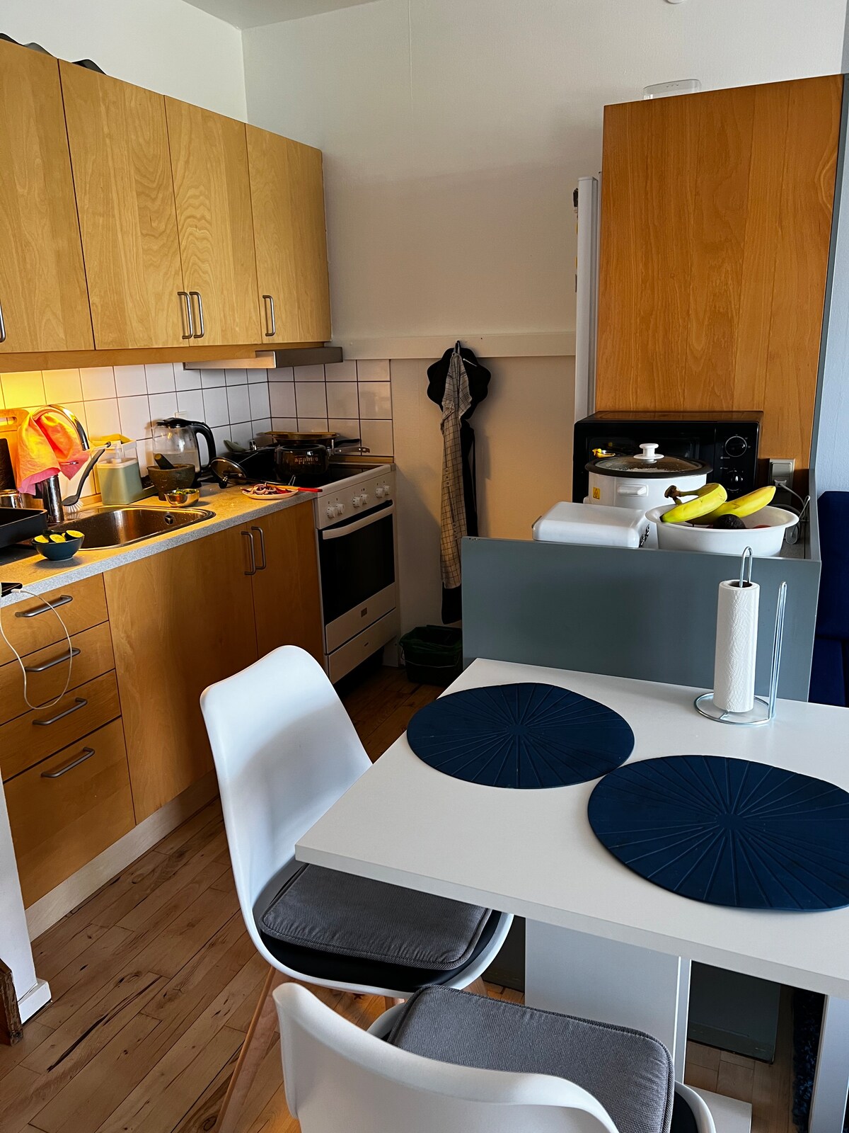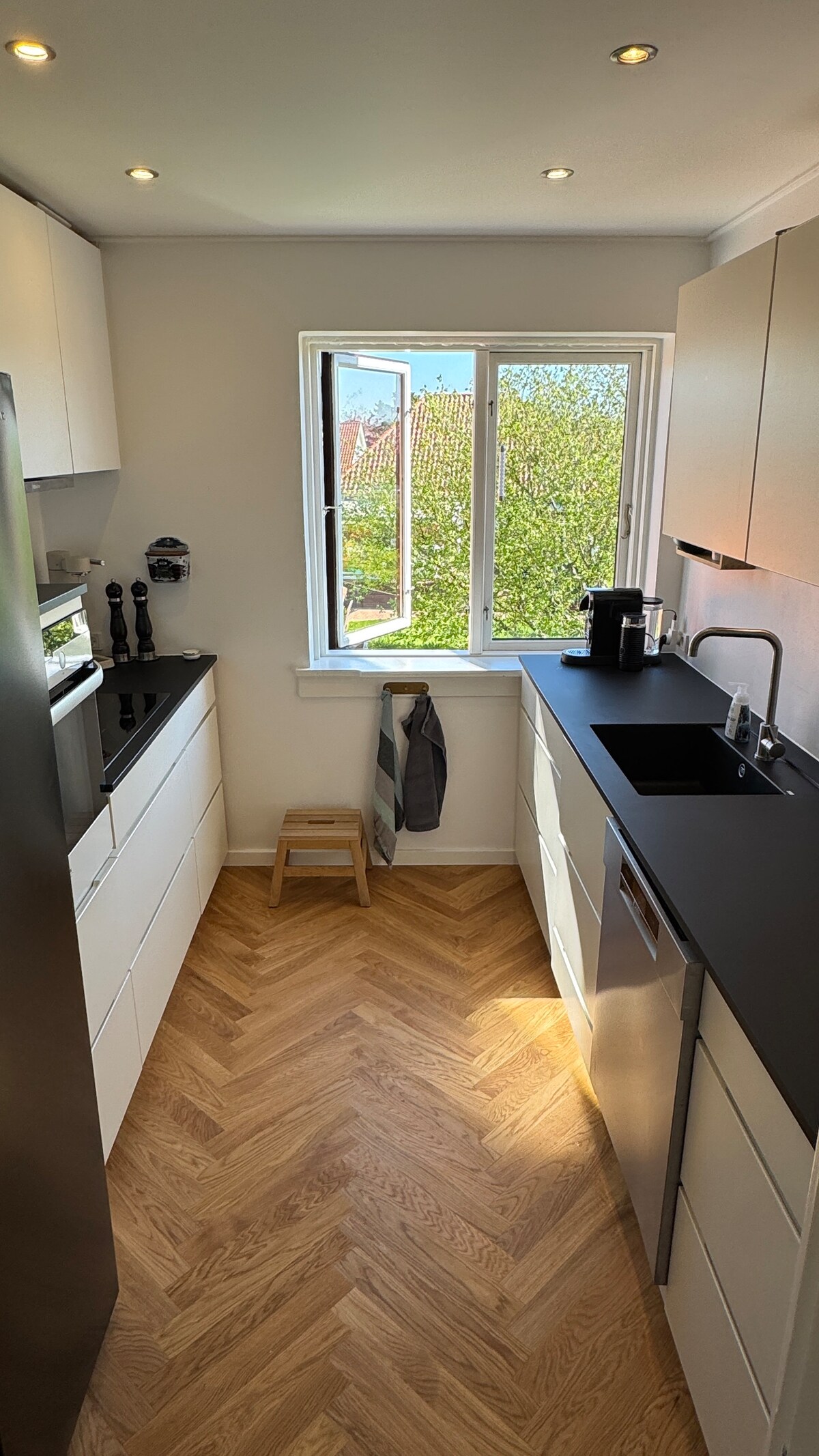 Välkommen till vårt hem, där rymlighet möter renlighet och ljusstyrka. Denna moderna fristad erbjuder en fantastisk utsikt över stadsbilden och bjuder in dig att koppla av och fördjupa dig i nybyggd stads charm — Grønttorvet. Från mars till oktober kan du uppleva den långa nordiska sommarsolnedgången från vårt vardagsrum/matsal. Med en öppen kökslayout är detta utrymme för att umgås för ett par, vänner eller en liten familj.