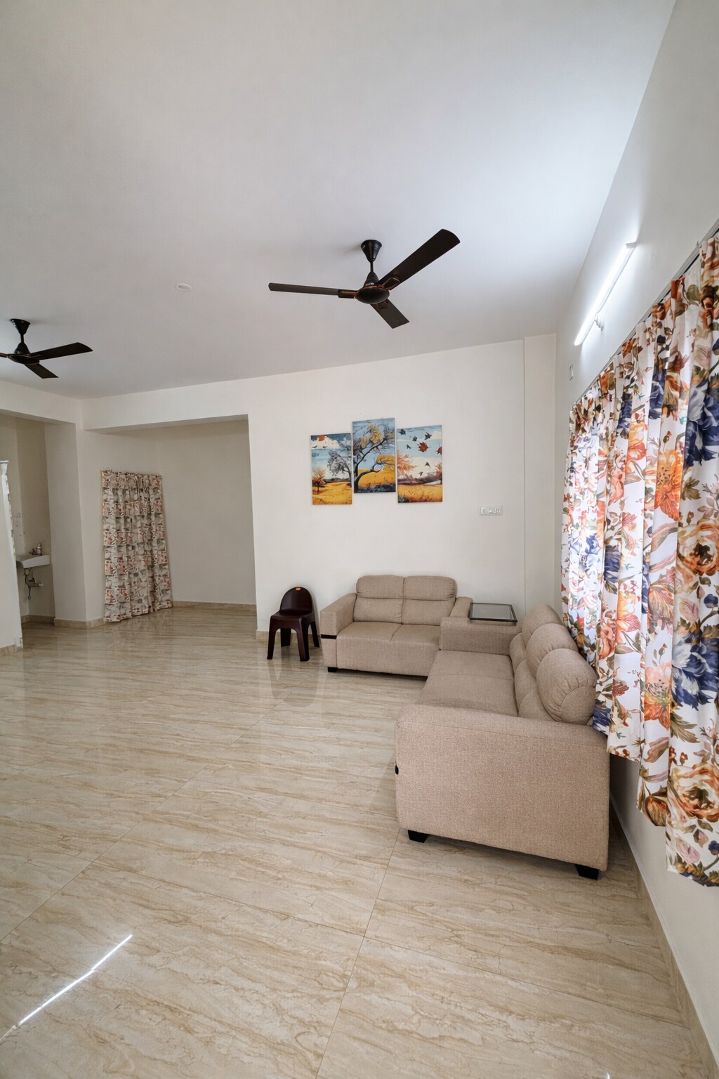 Stylish, fully furnished apartment designed for comfortable Airbnb stays. It features a modern modular kitchen with a refrigerator, a cozy bedroom with a double bed and wardrobe, clean tiled flooring, and warm ambient lighting throughout. The space is secure, well-maintained, and thoughtfully designed - ideal for families and working professionals seeking short or long stays. Note: This property is strictly for pure vegetarians, and unmarried couples are not allowed.