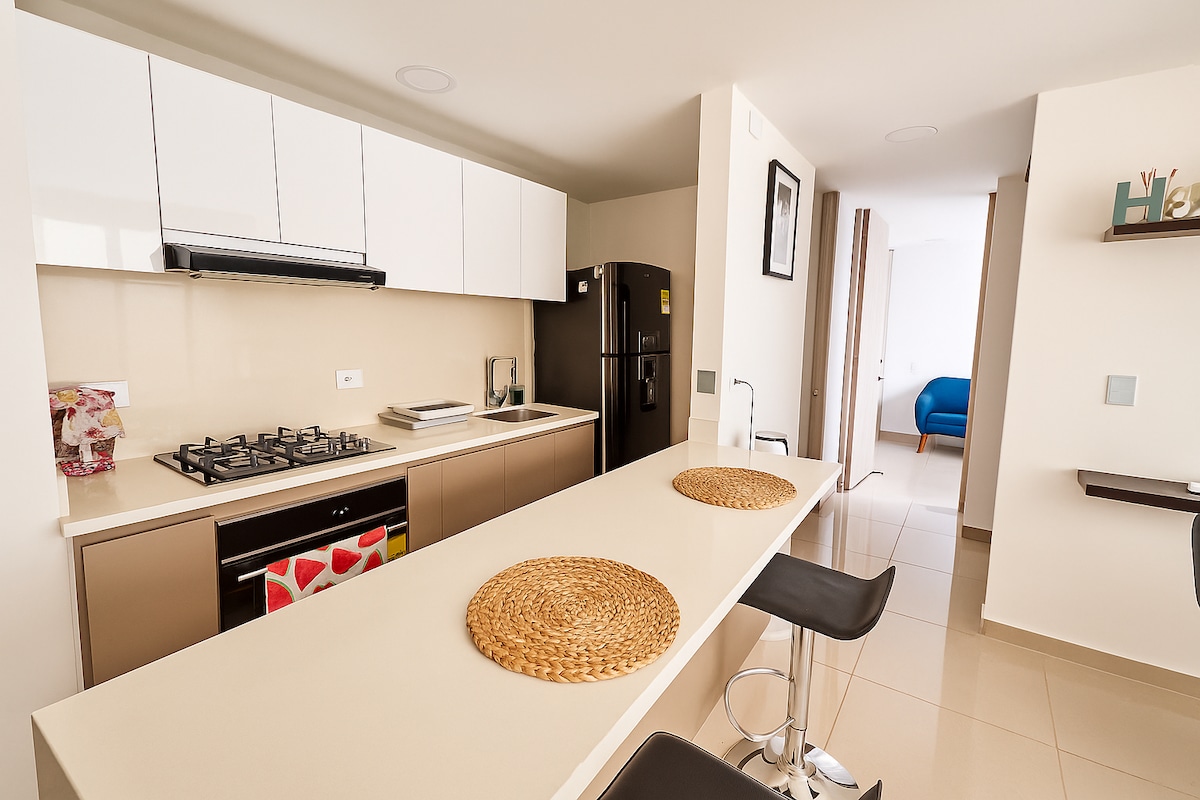 Central lägenhet, nära stationen, sportpark, coliseum, Aqua, cr 5ta och Guabinal avenue. Tyst, rymligt, med gratis parkering för två fordon; efter det debiteras det. Känn dig som hemma, med bekväma premiumsängar, köksredskap, schampo och kroppstvål, allt utformat för att välkomna våra gäster som familj. Matplats i komplexet, butik, bar och pizzeria. 24-timmars övervakning. Direkt hiss från parkeringen.
