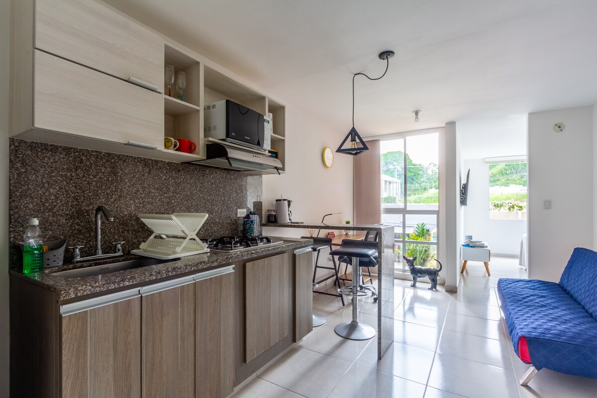 🌿 Vakna omgiven av gröna berg på det bästa läget i Ibagué 🌿 Bo i en modern, mysig studio på Calle 60, stadens Golden Mile. Bästa restaurangerna och gallerior som La Estación och Acqua ligger några steg bort, Multicentro bara 10 min. Njut av panoramautsikt, ett fullt utrustat kök, gratis parkering och ta med ditt husdjur🐾. Perfekt för par eller affärsresor – kom och utforska Colombias musikaliska huvudstad! 🎶