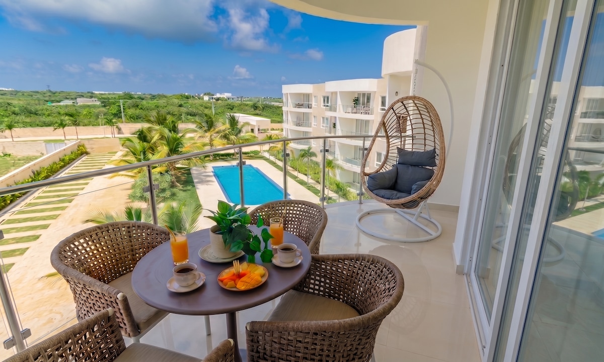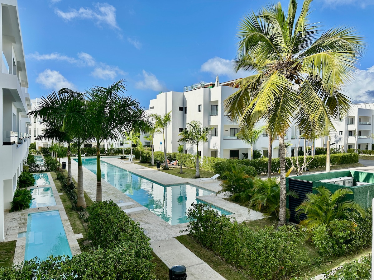Njut av en lyxig 2-rumslägenhet i Vista Cana, det mest exklusiva bostadsområdet i Punta Cana, med en golfbana, konstgjord strand, pooler och restauranger. 📍 Minuter från centrala Punta Cana, stormarknader och Gold's Gym ✈️ 10 minuter från Punta Canas internationella flygplats. 🛺 Golfbil tillgänglig (extra kostnad), perfekt för att ta sig runt Vista Cana bekvämt. Perfekt för familjer, par och resenärer som söker komfort, exklusivitet och säkerhet.