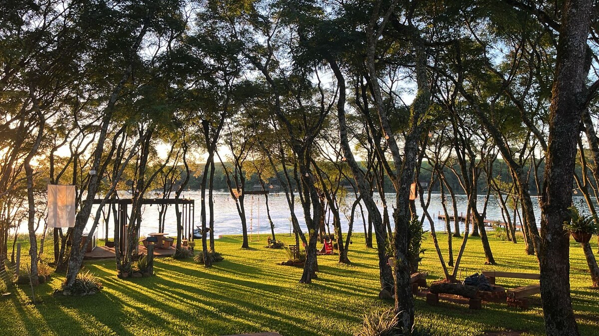 Njut av fantastiska stunder vid Ernestina-dammen! Cabana med direkt tillgång till vatten, fullt utrustat, med fullt utrustat kök, luftkonditionering, sovsal och mezzanin! Det har ett badtunna för två personer på balkongen, med uppvärmning och färgterapi! Enorma innergård för bra familjeögonblick, med en sekulär kork! Kiosk med grill och trädäck för en otrolig kväll! Njut av Recanto Rosabela! Välkommen!