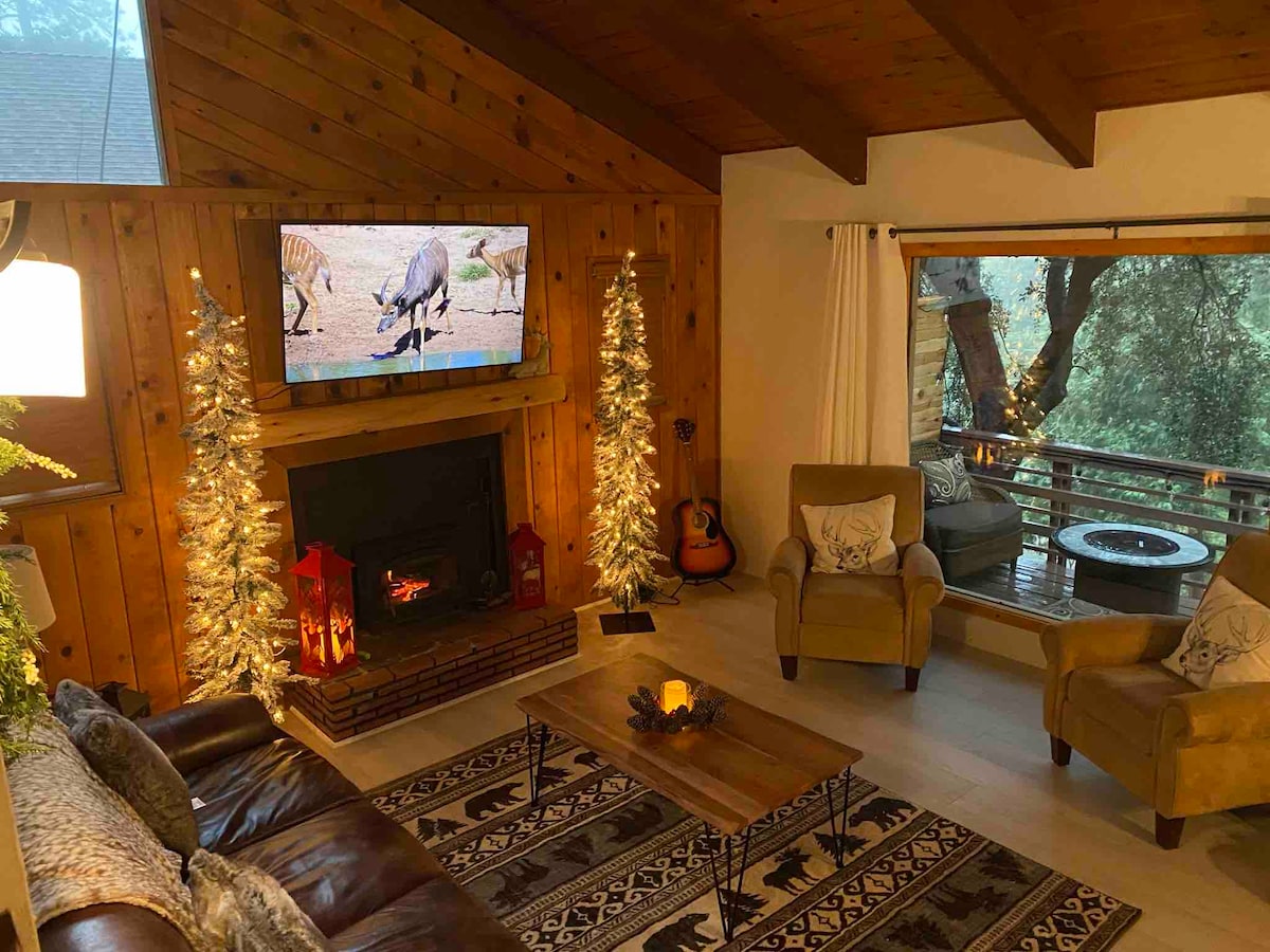 Koppla av och ladda upp i denna fridfulla och eleganta stuga. Från altanen har du en fågelperspektiv över höga tallar och bergstoppar. Efter en dag av utforskning av de närliggande vandringslederna och den charmiga staden Idyllwild, njut av bubbelpoolen, slappna av runt eldstaden och mys framför steneldstaden. Sov gott i bekväma, mysiga sängar. Denna magiska stuga från mitten av århundradet är det perfekta stället för dig att andas in den friska bergsluften, fly vardagen och återförenas med naturen. Husdjur välkomna!