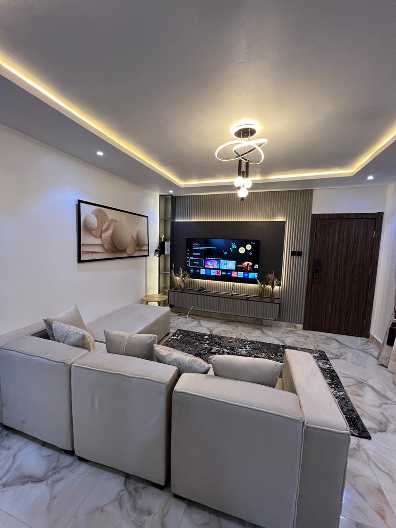 Rymligt vardagsrum och kungligt rum med Super king-säng, modernt badrum och toalett🚽. Väldigt ren och standardlägenhet. Royal Pent House ger dig all modern komfort utöver din fantasi med obegränsat höghastighets WiFi, 43 tumsmart TV i sovrummet och 55 tums Smart TV i vardagsrummet, YouTube, Netflix, DSTV. Bekväm soffa, varmvattenberedare, vattenkokare, mikrovågsugn, matlagningsgas. Brandvarnare, monodioxidlarm, ström dygnet runt. , Cctv, maximal säkerhet med säkerhetspersonal dygnet runt