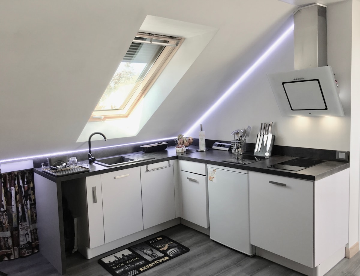 Loftslägenhet med trädgård, 10 minuters promenad till skogen