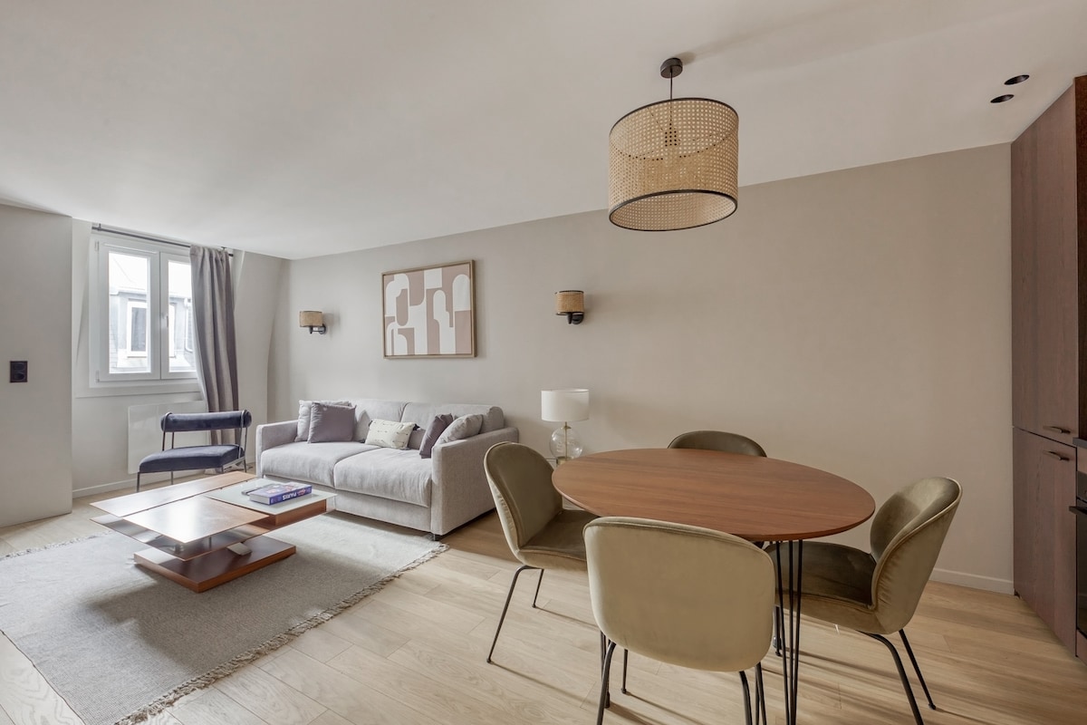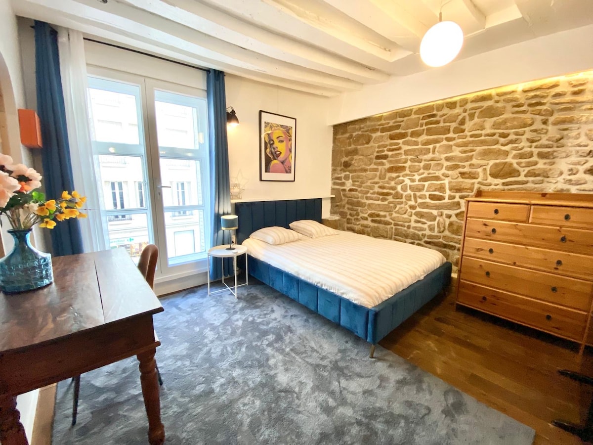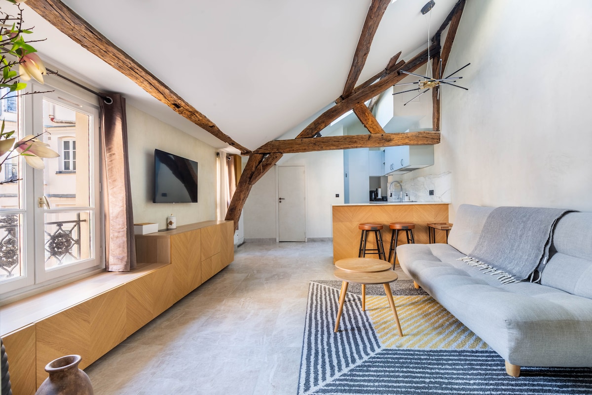 Bo i en lugn och ljus takvåning, bara några steg från Louvren och Notre-Dame. Njut av en mysig atmosfär med en öppen spis, piano och skivspelare, samt ett ljust kök för gemytliga måltider. Ultrasnabbt WiFi, luftkonditionering och en dedikerad arbetsyta gör det till en idealisk plats för resenärer, par, par med 1 barn, baby och distansarbetare.