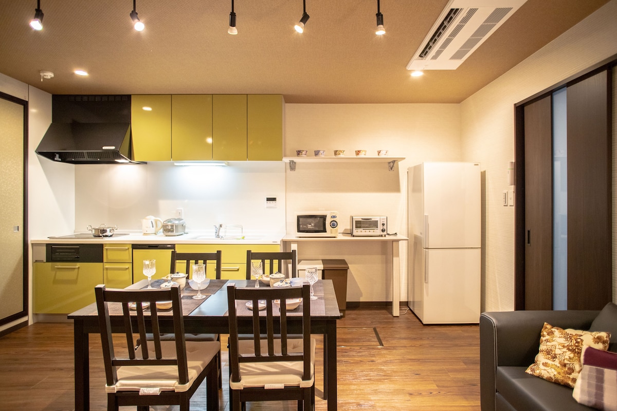E1 Kyoto Shijō Kawaramachi, mycket bra läge, 128 m2 3+1-rum, hiss, matbord för 10 personer för att äta och umgås tillsammans