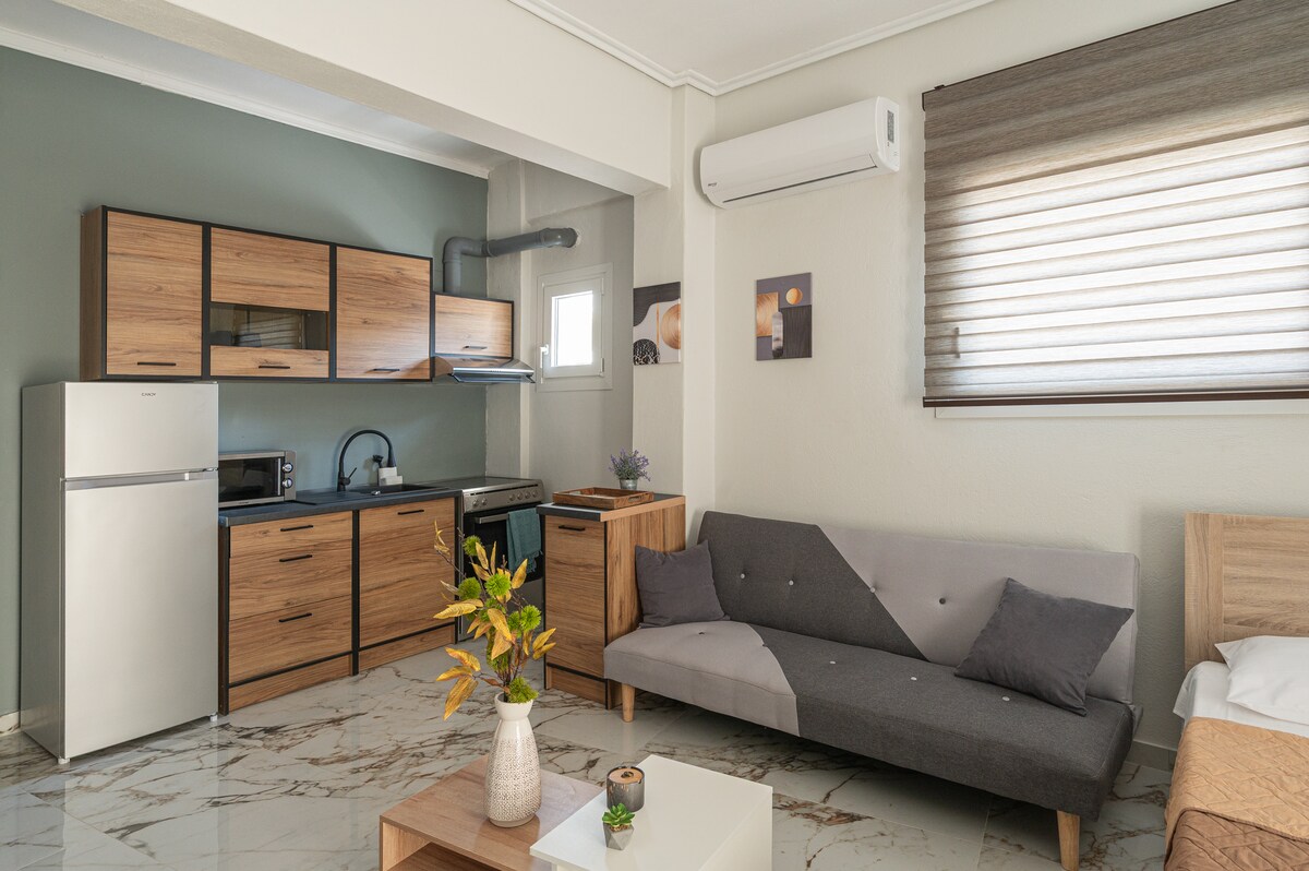 Mysig och modern lägenhet bara 250 m från stranden i Paralia Katerinis! Lägenheten har ett ljust vardagsrum, fullt utrustat kök, ett bekvämt sovrum med dubbelsäng, elegant badrum och privat balkong. Perfekt för par, familjer eller vänner. Butiker, restauranger och Lidl stormarknad ligger inom gångavstånd, vilket gör det till den perfekta platsen för avkoppling och bekymmersfria semestrar.