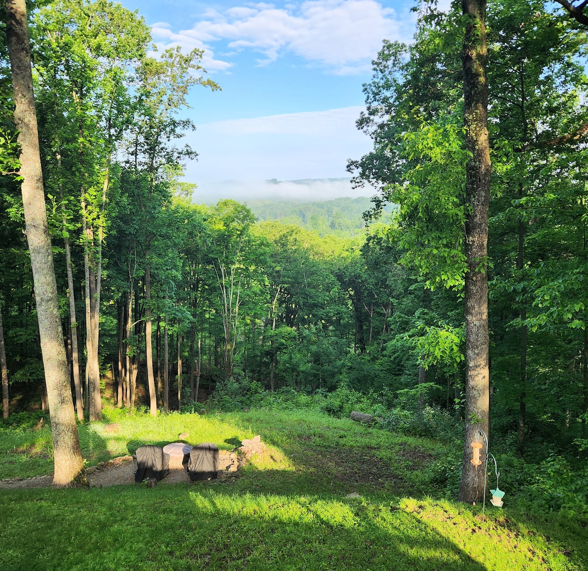 Smakfullt inrett boende perfekt för en avkopplande tillflykt. Perfekt för par, resenärer eller flickvänner! Bottenvåning (2-våningsenhet med övervåning tillgänglig mot en extra kostnad, annars inte uthyrd). Queen-säng + bäddsoffa. 55 tum TV med Showtime. Massagestol. Internet tillgängligt men ojämnt på grund av landsbygdsområde. Stor privat bubbelpool och eldstad omgiven av skog och majs! Ved tillhandahålls utan avgift. Plus en ny bastu när utomhustemperaturen är över 40 °F.