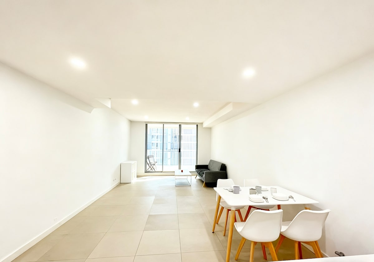 Välkommen till vår eleganta och minimalistiskt inredda lägenhet med 1 privat och 1 öppet sovrum. 3 minuters promenad till Mascot tågstation och 4 minuter med tåg till Sydneys flygplats – perfekt för tidig flygning och ankomst från en långresa. Enkel åtkomst till populära sevärdheter i Sydney. 🚆Mascot Train Station: Erbjuder direkt tillgång till Sydney CBD på cirka 9 minuter 🚗 Bara en kort bilresa till SEA LIFE Aquarium Sydney och Sydney Opera House