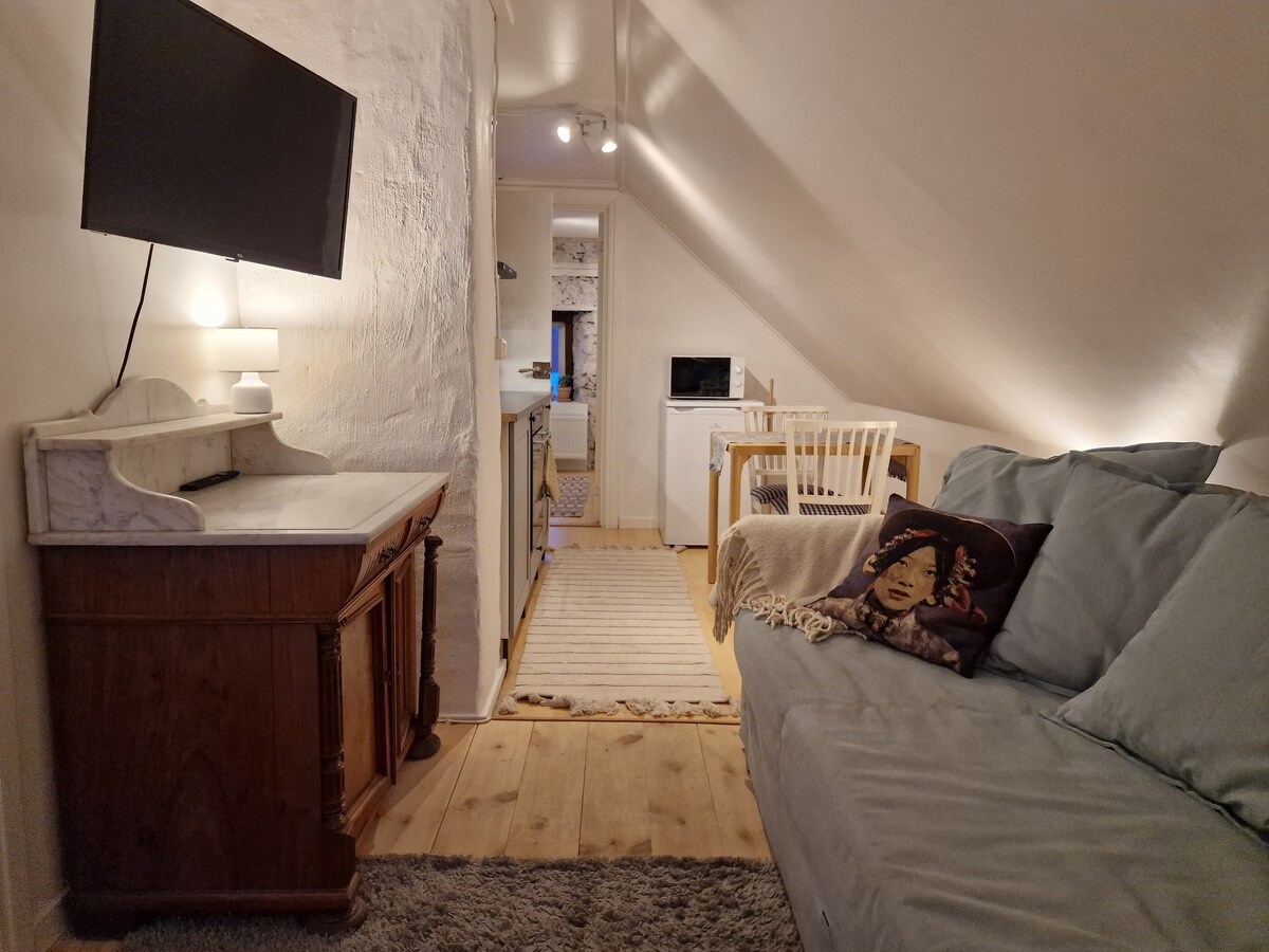 Här bor man kort och gott på stranden i en liten låda. Strandboden är som ett precis som ett exklusivt litet hotellrum, men en stor dubbelsäng och en liten sitthörna. Här finns ett litet kitchenette med utrustning för två, för att laga en god frukost eller en måltid för två Strandboden ligger precis vid klapperstens stranden och här är det vågornas brus som lugnt vaggar er till sömns på natten. Badrummet är byggt separat, bara ett par korta steg från huset.