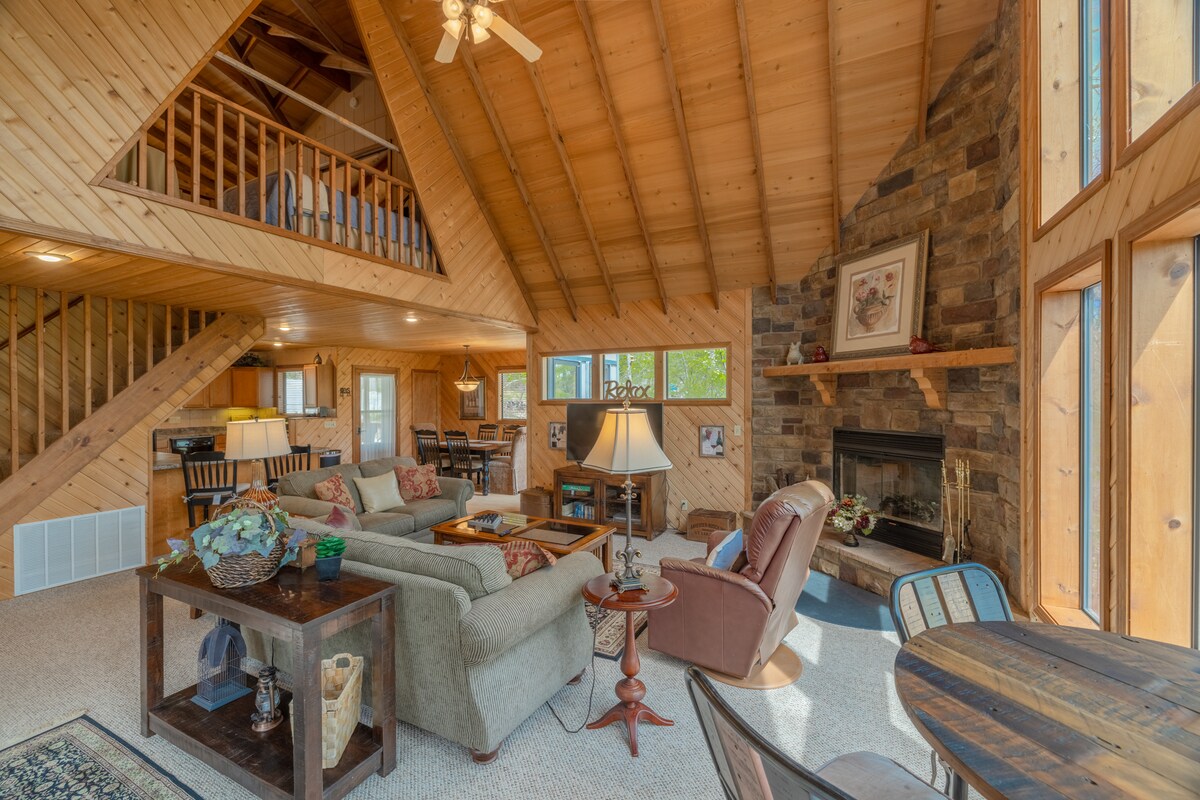 Inbäddat i skogen med utsikt över Foxfire Lake erbjuder denna A-frame det perfekta fyra säsongers flykt. När snön faller förvandlas den till den väsentliga vinterretreaten. Mys bredvid den stenkamin, där utsikten över sjön är inramad av frostade träd. När vädret blir varmare, kallar sjön! Njut av direkt tillgång till Foxfire Lake från vår privata brygga. Tillbringa dina dagar med fiske, simning eller helt enkelt sola. Denna stuga hjälper dig att hitta glädje och avkoppling, oavsett årstid.