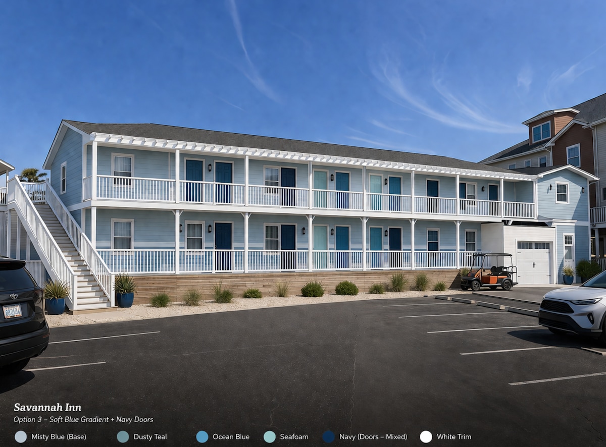 Mysigt dubbelrum för 2 i ett charmigt boutique motell bara 1 000 meter från stranden och historisk strandpromenad. Njut av självincheckning, gratis parkering och en pool på plats. Husdjur är välkomna! Rummet inkluderar kaffebryggare, kaffe, mikrovågsugn, fräscha sängkläder och uppdaterade möbler. Duschkabin, uppvärmning och A/C för komfort. Steg från shopping, barer och restauranger - parkera en gång och utforska till fots. Koppla av på din privata veranda med uteservering. En perfekt tillflyktsort vid kusten, även för sista minuten-planer!