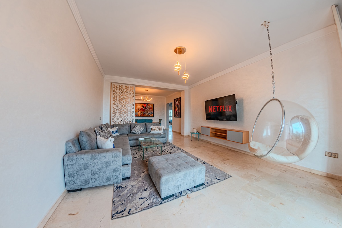 Välkommen till detta charmiga boende där modern design möter värme. Denna lägenhet är omsorgsfullt inredd med eleganta detaljer, lugnande färger och en subtil marockansk touch och erbjuder den perfekta balansen mellan stil och avkoppling, vilket gör den idealisk för familjer eller par som söker komfort och lugn. Denna lägenhet ligger i ett rent, nybyggt bostadsområde bara 5 minuters promenad från stranden och marinan och erbjuder den perfekta balansen mellan komfort och läge för att koppla av eller utforska Agadir.
