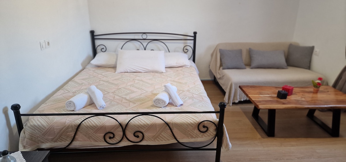 Välkommen till vårt charmiga, traditionella grekiska sommarhus, idealiskt beläget bara 500 meter (10 minuters gångavstånd) från den vackra Mylopotas Beach. Inbäddat på en rymlig 10 000 kvadratmeter stor fastighet, sträcker sig huset över 45 kvadratmeter och erbjuder den perfekta blandningen av integritet och avkoppling, vilket gör det idealiskt för familjer, vänner eller par som söker en lugn flykt. Med sin traditionella grekiska charm är sommarhuset utrustat med allt du behöver för en avslappnad semester. Välkommen hem