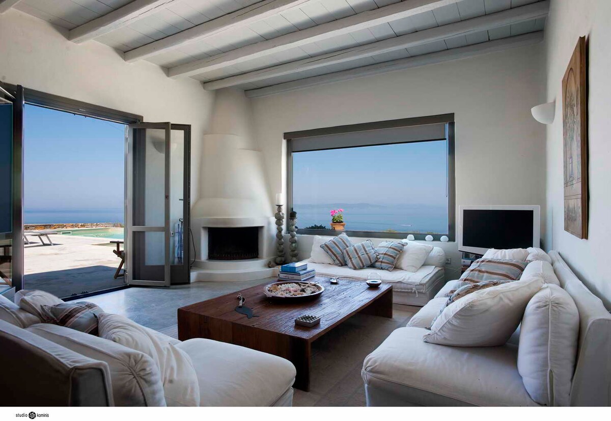 I en 2.000 kvm trädgård, 240 meter från havet, vacker villa med fem sovrum, med underbar utsikt över Egeiska havet och oförglömliga solnedgångar. Med TV och luftkonditionering i varje rum är dubbelsängarna 1,60 X 2 ,rymmer 11 personer. Fullt möblerad och hushållsutrustad. Simbassäng, utvändig dusch, soltäckt och vindskyddad möblerad 500 kvm terrass med tre inbyggda soffor och två inbyggda matbord för tolv och åtta pers, solskuggade solstolar. Omgivningsmusikhögtalare , dimmerstyrd belysning.Utanför bar med diskbänk, minibar och pallar , 2 grillar , (en med kol och en med gas ) och en utomhusugn ( arbetar med trä) och ett diskbänk. Närmaste flygplats : athens vid 30 Kilometer Närmaste strand : vid 2 Kilometer Bil: nödvändigt (Privat parkering vid villans tillstånd) 50 km från Aten , 30 km från flygplatsen Ligger bara 2,5 km från huvudhamnen (Korissia), och 6 från Vourkari hamn. På ett avstånd av 2,5 km finns alla typer av faciliteter tillgängliga, dvs. banker , restauranger , barer , kaféer , apotek , butiker , diskotek , stränder etc.