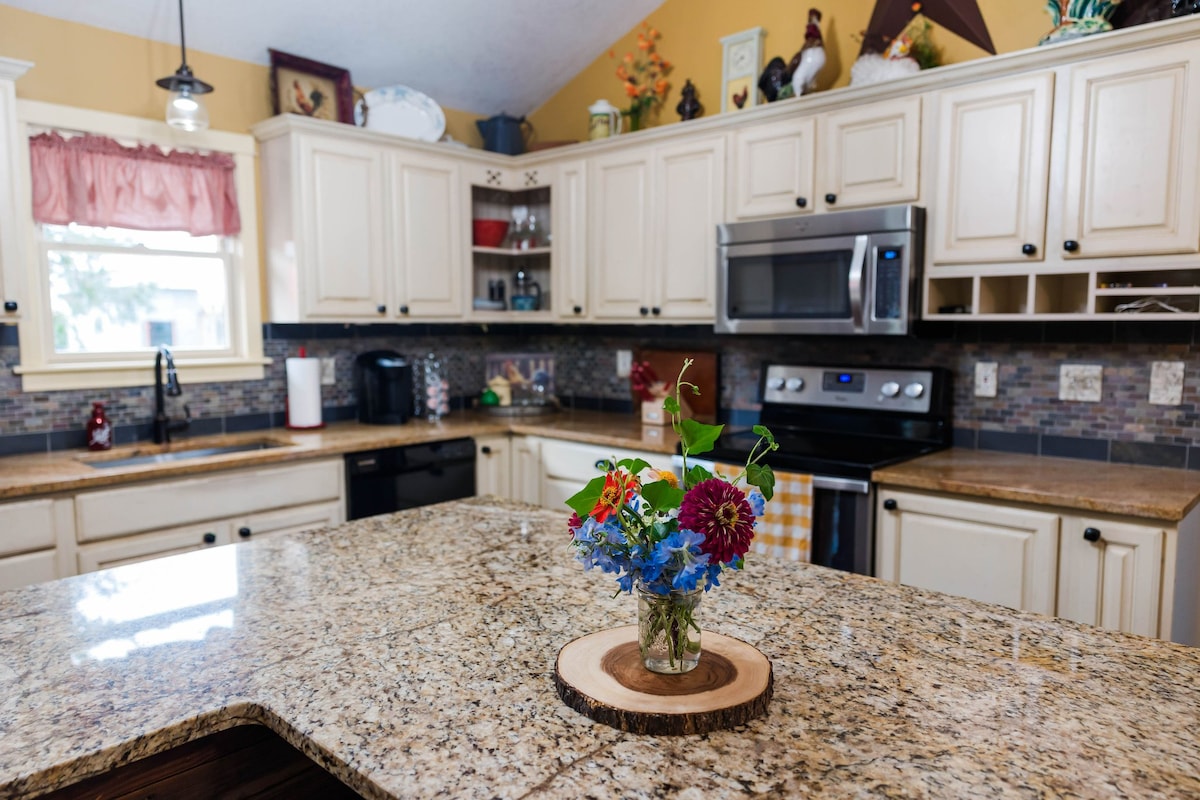 Öppen planlösning, våningssäng, queen-säng, bäddsoffa och loftsäng i full storlek, inkluderar ett pentry komplett med minikylskåp, mikrovågsugn, stekpanna, dubbel kaffebryggare och brödrost. Möblerad med porslinsset, några redskap, k-cups, handdukar och sängkläder förutom filtar. Utomhus picknickbord, eldstad, grill och täckt veranda, komplett med gungstolar och en återvunnen kyrka för att njuta av en lugn kvällssolnedgång eller en lugn morgonsoluppgång.