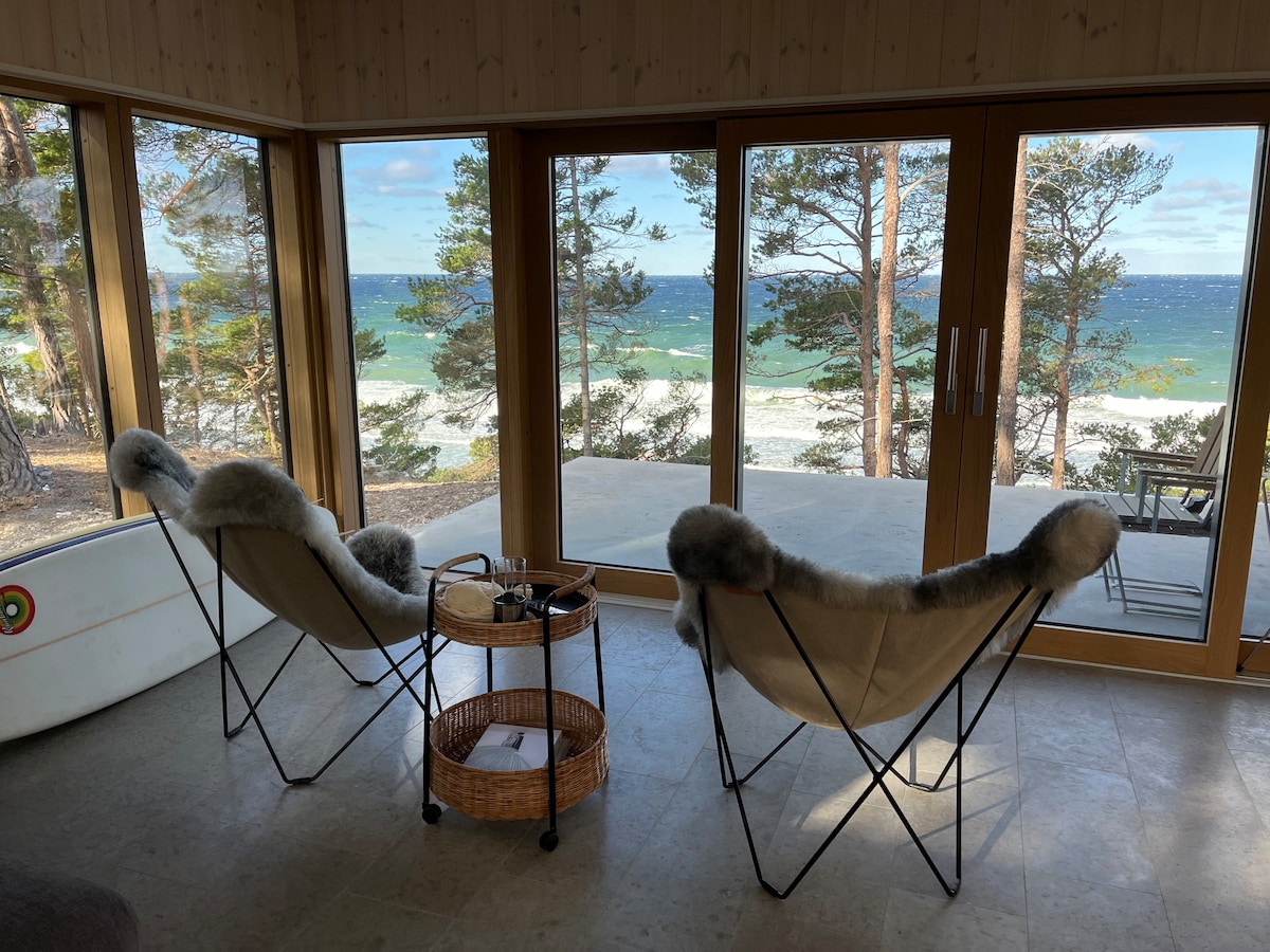 Här bor man kort och gott på stranden i en liten låda. Strandboden är som ett precis som ett exklusivt litet hotellrum, men en stor dubbelsäng och en liten sitthörna. Här finns ett litet kitchenette med utrustning för två, för att laga en god frukost eller en måltid för två Strandboden ligger precis vid klapperstens stranden och här är det vågornas brus som lugnt vaggar er till sömns på natten. Badrummet är byggt separat, bara ett par korta steg från huset.