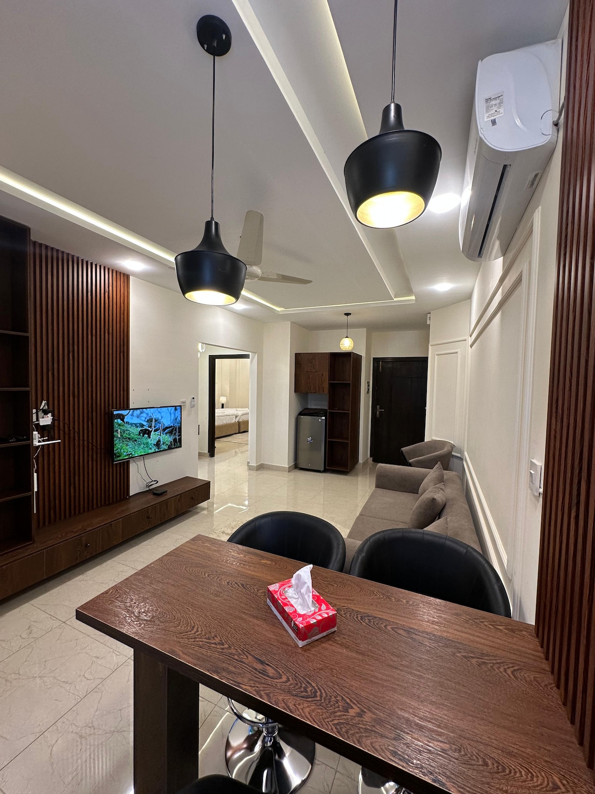 Mysig och elegant 1BHK-lägenhet med självständig incheckning Smart Lock, 60-tums TV och Prime Location med träinredning, perfekt för en bekväm vistelse. Njut av kylning och uppvärmning dygnet runt och varmt vatten. mysiga sängar, plyschsoffor och Netflix på 60-tums smart-TV. Fullt utrustat kök med kylskåp, ugn och snacks. Schack och luddo. Egen balkong, självincheckning, egen ingång, direkt tillgång till hiss och gratis parkering. Nära till kända restauranger och toppattraktioner som Faisal-moskén, Monal, F9 Park och Lake View.