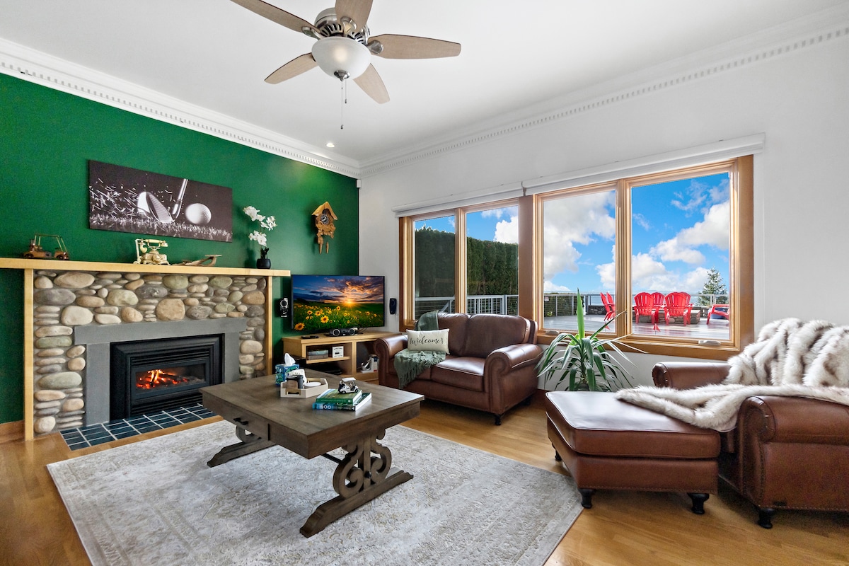 Denna otroliga högbanksegendom kombinerar slående panoramautsikt över bergen, havet och öarna med en modern och nyrenoverad interiör. Upplev några av de bästa solnedgångarna i ditt liv från det stora utomhusdäcket som inkluderar en grill (maj-september) och en utomhusmatplats (eldstad för närvarande inte tillgänglig). Njut av den stora bastun för 4 personer, i hemmet gym, öppet golvkoncept, mysigt vardagsrum och TV-område, vit tegelgaskamin och 3 dedikerade arbetsytor med höghastighets Wifi.